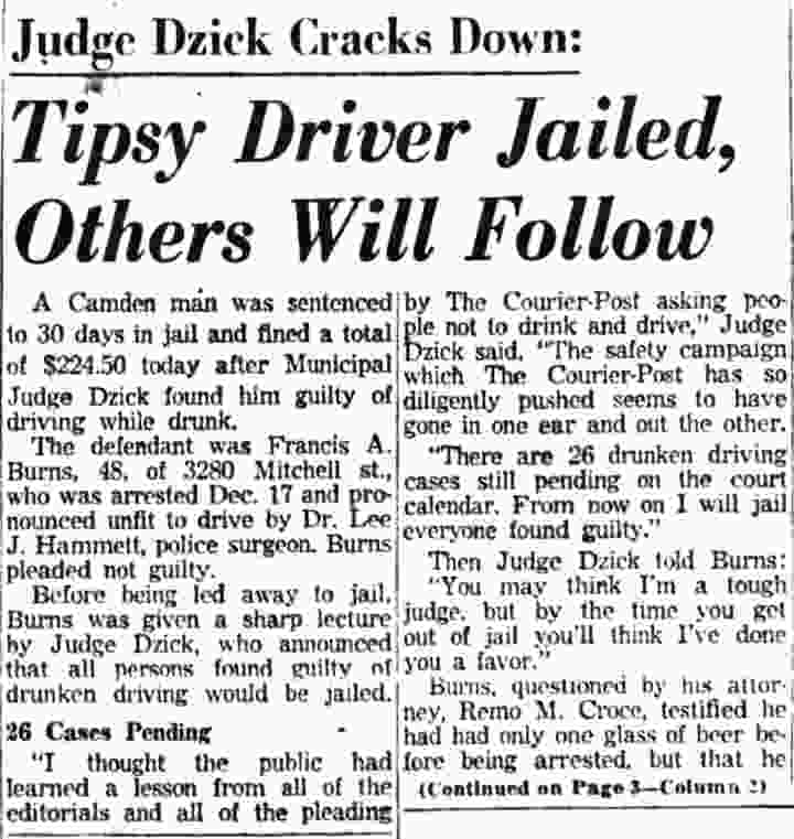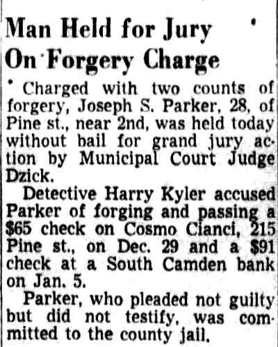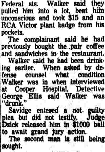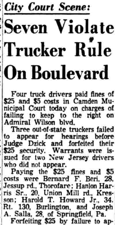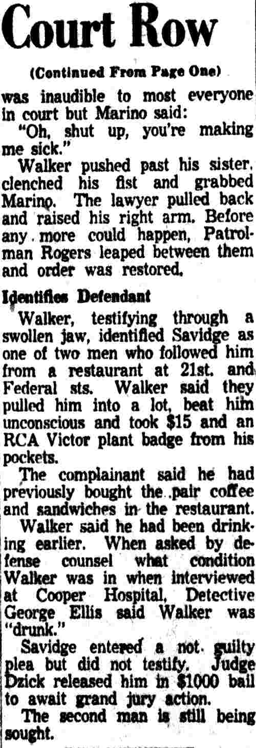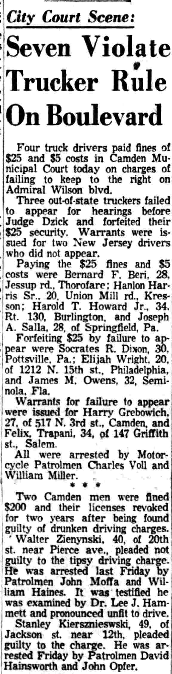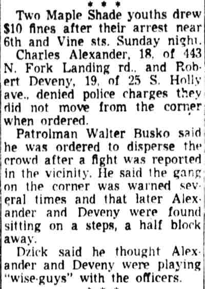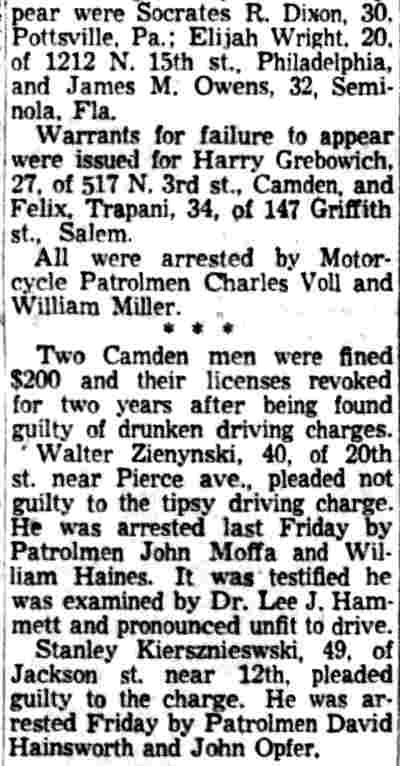 Court Scene: A Barrington man went to county jail for 30 days after Judge Dzick ruled him guilty of passing worthless check for rental of an auto. The sentence- 30 days and $25 fine- was imposed on Ralph Visco, 35, of 338B Barrington Manor Apartments. Visco, police said, operates a filling station at 100 Grove Street, Haddonfield. He was arrested on complaint of Augustus Gondolf; manager of an auto rental agency, 35 North 5th Street. Gondolf charged Visco tendered him a worthless check for $178 last December 10. When arraigned today, Visco told Prosecutor Anthony Lario he wanted to make restitution and took a check from his pocket. Dzick said he thought Visco had "a lot of nerve offering to make good on a bad check with another check" and added: "I'm getting a little tired of persons passing worthless checks and I don't care whether the checks are made good later … the crime occurs when the check is first passed". * * * Alexander Chambers; 50, of 635 North 5th Street, was held for grand jury action, charged with rape on a 14 year-old girl. He pleaded not guilty, Chambers was arrested on a complaint of the girl's mother. * * * Judge Dzick fined two men $10 each for assault and battery. Fined were John Tubman, 635 Locust Street, and James Jones, 238 Chestnut Street. |