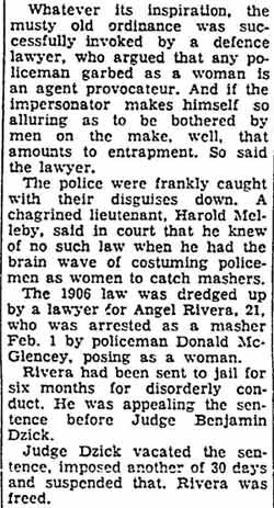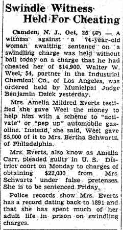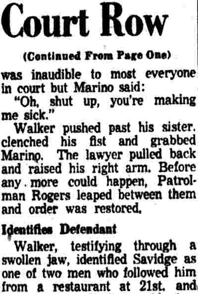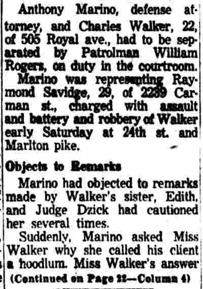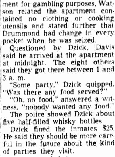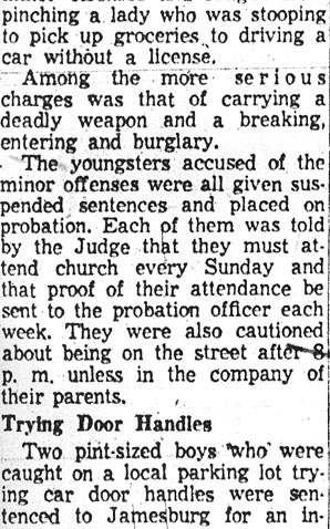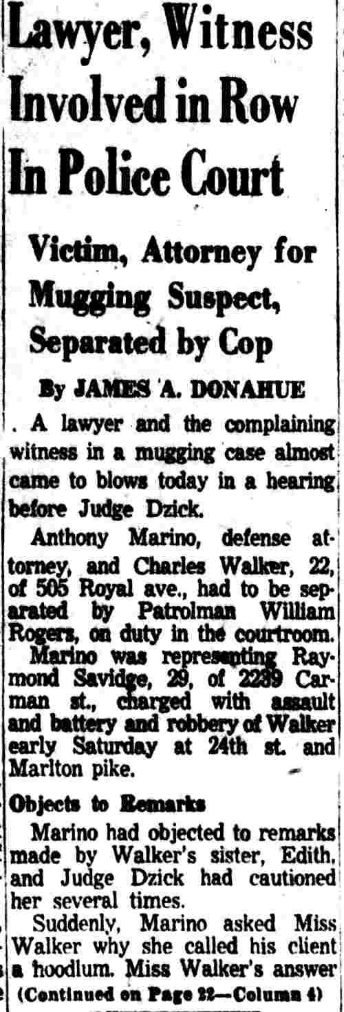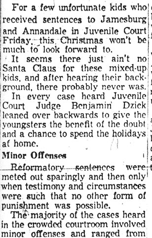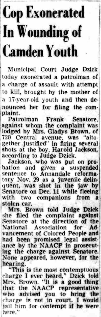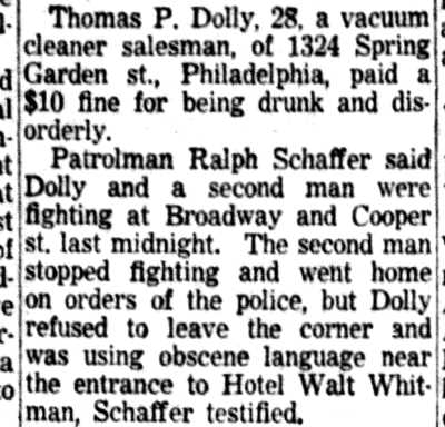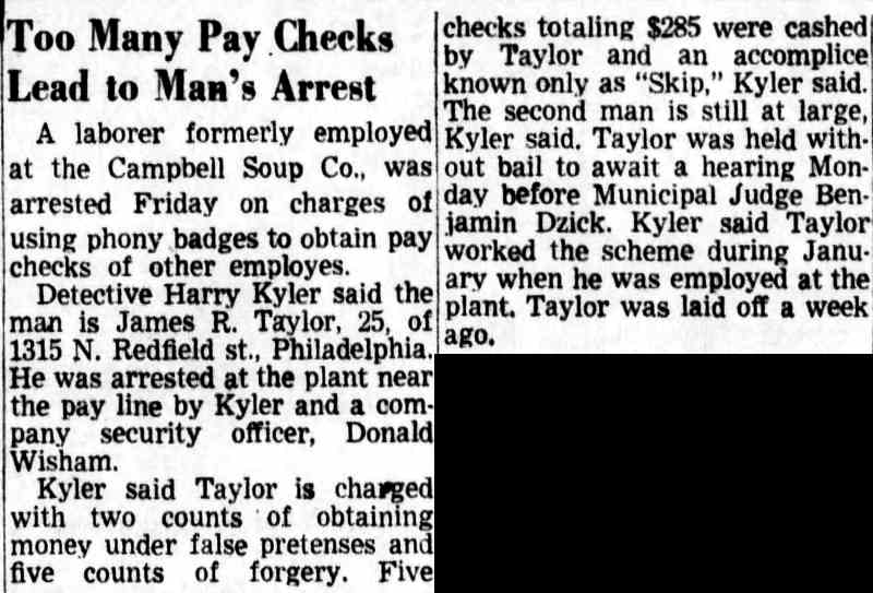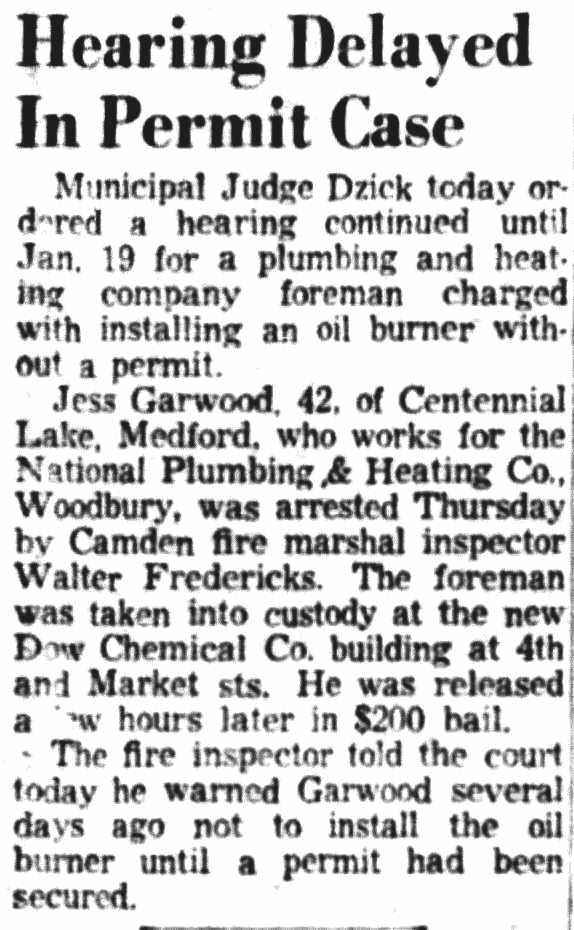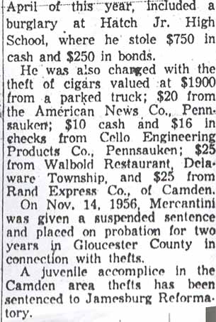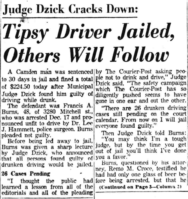 Court Scene: A Barrington man went to county jail for 30 days after Judge Dzick ruled him guilty of passing worthless check for rental of an auto. The sentence- 30 days and $25 fine- was imposed on Ralph Visco, 35, of 338B Barrington Manor Apartments. Visco, police said, operates a filling station at 100 Grove Street, Haddonfield. He was arrested on complaint of Augustus Gondolf; manager of an auto rental agency, 35 North 5th Street. Gondolf charged Visco tendered him a worthless check for $178 last December 10. When arraigned today, Visco told Prosecutor Anthony Lario he wanted to make restitution and took a check from his pocket. Dzick said he thought Visco had "a lot of nerve offering to make good on a bad check with another check" and added: "I'm getting a little tired of persons passing worthless checks and I don't care whether the checks are made good later … the crime occurs when the check is first passed". * * * Alexander Chambers; 50, of 635 North 5th Street, was held for grand jury action, charged with rape on a 14 year-old girl. He pleaded not guilty, Chambers was arrested on a complaint of the girl's mother. * * * Judge Dzick fined two men $10 each for assault and battery. Fined were John Tubman, 635 Locust Street, and James Jones, 238 Chestnut Street. |