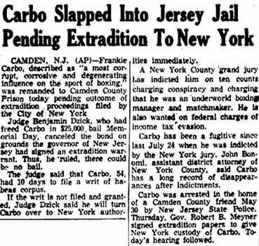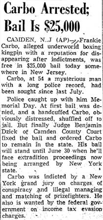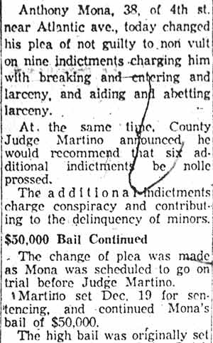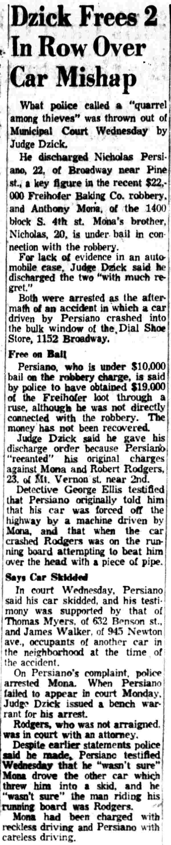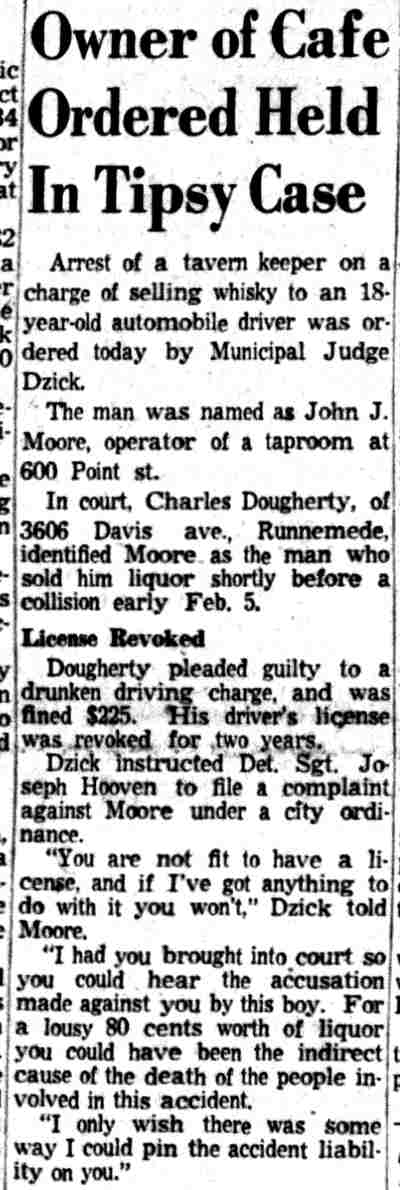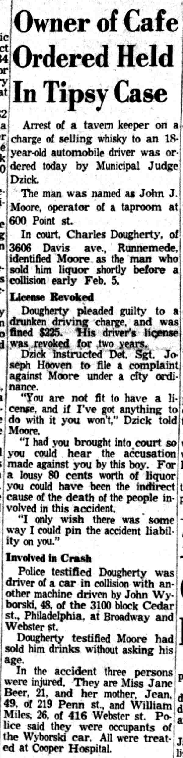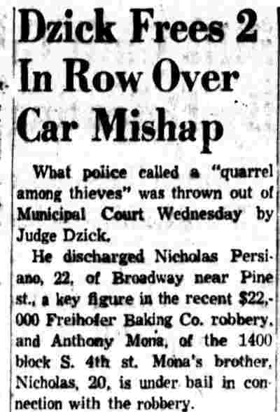 Feed Bag: Former Judge Joseph Varbalow will soon announce he has purchased the Towers and Broadway Theatres from the Ellis family … Circuit Court Judge V. Claude Palmer will probably file his decision today in the fraud charges made by the Republican League against the election of Freeholders Ciechanowski and Francesconi … Since Judge Palmer told the Democratic attorney, Alex Feinberg, that Feinberg must complete his entire case in a half a day "because, frankly, 1 don't see what answer you can make to this testimony," you can draw your own conclusions about what the decision will be … Incidentally, Judge Palmer will take a plane July 12 for a vacation at Calgary in the Canadian Rockies … The name of Walter Uliase, Seventh ward Democrat, has been withdrawn from powwows on appointments to the county tax board, .. Senator Al Driscoll was willing to okay Joe Ackroyd, Democrat, as successor on the board to Fred Schorpp, whose term expired a few weeks ago, .. The Republicans are said to have figured that in that way, they could hold Victor King on the board awhile longer, even though his term expired more than a year ago … Lee Smith, former WPA director; is still a possibility for the tax board job … The Democrats are holding frequent conferences on who the assistant prosecutor shall be … Police Judge Gene R, Mariano, a strong contender, has reportedly been dropped with Ben Dzick, Tony Mitchell, Charlie Rudd and the Kraft boys still in the running … Police court habitues believe that Gene himself announced indirectly that he had been eliminated when he said from the bench, while hearing a case, "Lady, you'll find that even your best friends sometimes stab you in the back. I found that out myself only 1 o'clock yesterday afternoon" … That was on Thursday … Mayor George Brunner told the dept that our guess was still I as good his, so that leaves Ben Dzick still with the fence position in the race … Mariano may be considered for the $5000 State job as sealer of weights and measures … *** Miscellany: Neil F. Deighan, the saloonman who led the opposition to a legislative bill which proposed that liquor manufacturers and wholesalers be prevented from selling goods to any retailer who owed them money and that all purchases be made with cash or quick payment credit plan (the bill will die in committee), is having his troubles with some wholesalers … Suits have been filed against Deighan and the Old Mill Inn, Inc., by Galsworthy, Inc., for $1713.51 plus interest; Joseph A. Reinfeld, Inc., for $1366.43 plus interest, and Majestic Wines and Spirits, Inc., for $1579.80 plus interest … The suits are in the New Jersey Supreme Court and allegedly represent unpaid balances of liquor bills … Tom Dickinson, courthouse custodian, is wearing a bright red face these days because the missus sent him to the store the other night for some sandwich meat for their guest…… Because of a similarity of trade names, Tom returned home with a package … Of razor blades … The new office of Bishop Eustace may be established at the old Rodger homestead at 721 Cooper street … Vice Chancellor Al Woodruff has left for Chile and some deep sea fishing. |