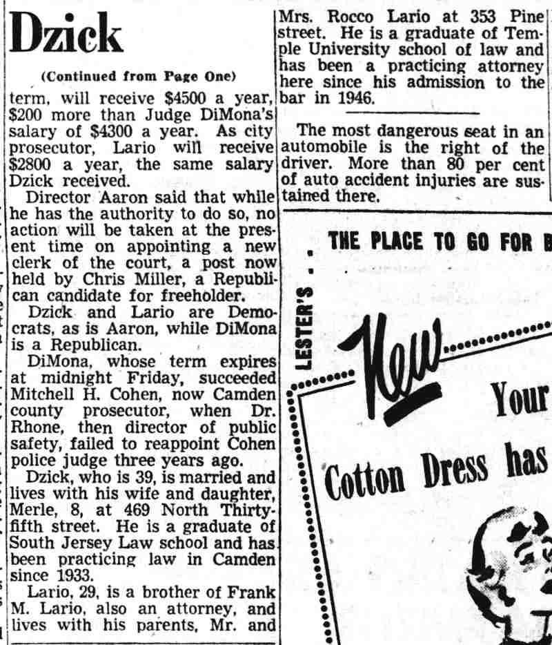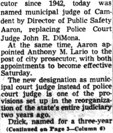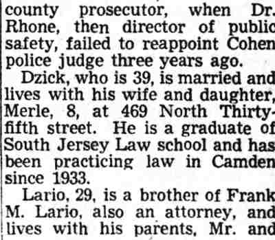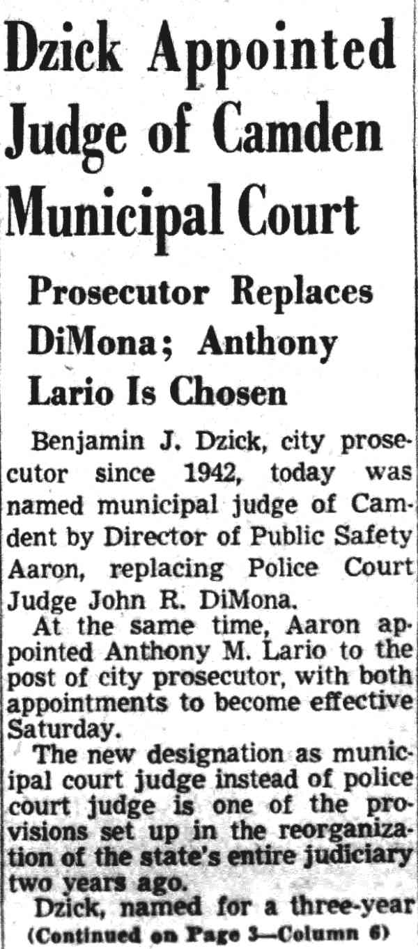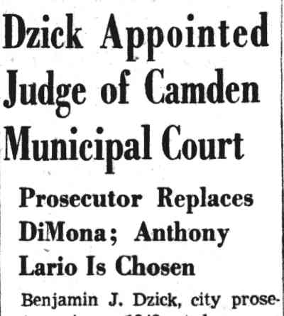 BENJAMIN DZICK was born June 1, 1910 to Nathan and Mary Dzick. His father was had a shoe repair business. The family, which included sisters Rae and Dorothy, lived at 3910-12 Westfield Avenue in East Camden. Benjamin Dzick graduated from the South Jersey Law School in Camden, and began practicing law in 1933. He was appointed city prosecutor in 1942. Benjamin Dzick appears in the 1947 City Directory as a lawyer, living with wife Minette Newton Dzick at 469 north 35th street in East Camden, which also was the home of Judge Dzick and his wife. Benjamin Dzick was an active member of Congregation Beth El at Park Boulevard and belleview avenue in Camden's Parkside section. Benjamin Dzick was appointed Municipal Judge in May of 1950, and served in that capacity, and later as a judge in the Camden County Court, until at least June 5, 1959. His mother, Mary Dzick, passed shortly after he was elevated to the bench, on July 7, 1950. In 1954 Judge Benjamin Dzick was chairman of the Camden County Israel Bonds Committee Judge Benjamin Dzick passed away in June of 1961. |
