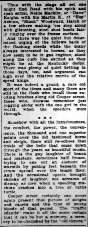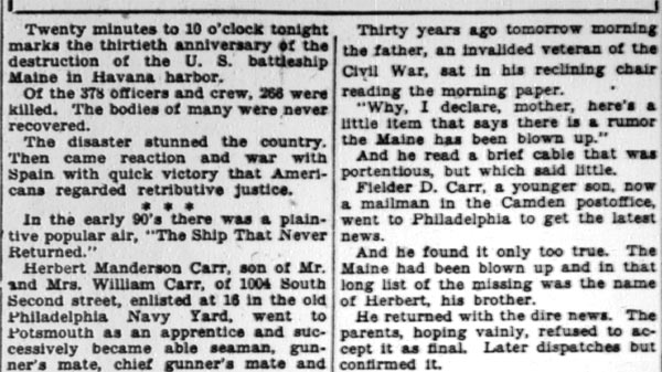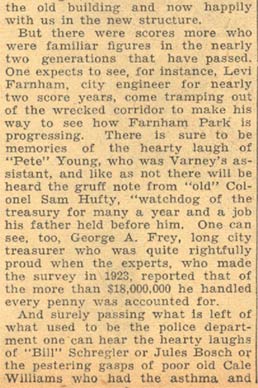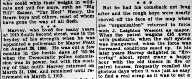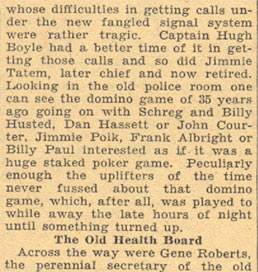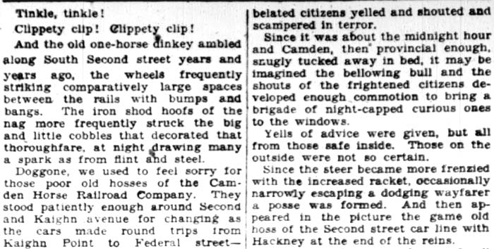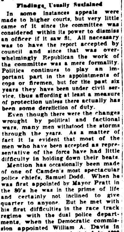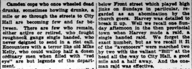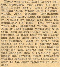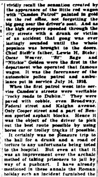 A False Alarm of Long Ago THERE were two alarms of fire Saturday evening, one at Fourth and Hamilton streets at 8:29 o'clock, and another at the West Jersey Ferry, an hour later. People in the vicinity of the first-named place turned out to look at the machines propelled at lightning speed by snorting equines, and wondered what it was all about; and some of them thought the wide-awake fire boys were beside themselves, as they asked, for the particular house, in the neighborhood of box 24 upon which, with steam up, their apparatus was able to put on, the water. The firemen and people were quietly informed by a party that drove away in a barouche that it was a designed deception. Under date of October 6, 1879, that was the introduction to a two-column story under a display headline. But, it was, a single line-"False Alarms." Readers of the period must have been as much mystified as were the firemen and citizens mentioned in the article, for it was not until more than half a column had been devoted to that incident that the public was let into the great secret. It was a test of the first fire alarm system introduced into Camden. Interest in that incident is revived by the city commissioners last week entering into a contract with that same concern to install in the new City Hall a system for somewhat more than $51,000. That first "system" cost the city $2000 but it was a big sum then and just about 10 times more space was devoted to it in the old Post than in the Courier-Post last Thursday week. Paid Department 10 Years Old Camden's paid fire department in 1879 was just 10 years old. It already was winning approval of even the recalcitrants, who had asserted back in 1869, that the old volunteer companies would certainly be missed; that the "professionals" would not have as much interest in putting out a fire as the boys who ran with the Perseverance, the Weccacoe and other organizations, usually bitter rivals. Not infrequently the volunteers battled over hooking up their hose while the fire burned, a event by no means outgrown since that occasionally happens even now, as files of the newspapers prove. But on that Saturday night 54 years ago, it developed that those who drove away in the mysterious barouche were J. W. Morgan, Crawford Miller and F. P. Pfeiffer; fire commissioners of city council, along with R. S. Bender and Thomas Beatty. They were but carrying out orders to see that the system worked and it was John T. Bottomley who issued those orders. He was Camden's big mill owner but more to the purpose in that particular incident, president of city Council. He had approved the fire alarm system but did not intend putting his O. K. on that $2000 bill until he had seen it in practical operation. So unknown to the firemen, and the citizens as well, it was determined to test that system by way of turning in the alarms. So an alarm was pulled at 8.29 and "Bart" Bonsall, son of Henry L. Bonsall, publisher of the Post, narrates, in just 15 seconds flat the bell was sounded at No.1 Engine House at fourth and Pine Street s. In two minutes hose cart No. 1 went bounding out with Driver George Hunt at the reins, followed by Ben Cavanaugh and his faithful nag "Jim" with cart No. 2. Then came Jake Kellum and William Davies with the engine No. 2 drawn by "Dolly" in 2.45. After that was engine No.1 driven by Edmund Shaw and the horse "Alec," coming along in 3 minutes and 5 seconds. It was explained Shaw was held up by the sandy roadway at fourth and line . Spectacular Sight Anyhow, it must have been a great sight for the old-time families who then resided along the Middle Ward Streets as the racing steeds bounded over Fourth Street, then into third over a mighty bumpy roadway. But they arrived and vainly sought the blaze. It was while they were hunting that the barouche came along and the commissioners let them into the great secret. "Bart" doesn't relate what the firemen said about the false alarm, but, like as not the heat of their expressions was a good substitution for the fire they failed to find. The system was one of those nine-day wonders that had the town on its toes. Everybody listened for the alarms in those days, for when they were sent in the bells in the fire houses pealed the number of the box. The strokes could be heard surprisingly far. Since there were but 11 boxes it was not long before many knew just where the fire was located and made a bee line for the scene. Old volunteers, particularly, never quite lost their interest in fires and, whenever they heard the alarm, hot footed it to the scene of excitement. That was all right when Camden was little more than a village, but as the community grew it became a serious proposition, since the racing citizens often interfered with the firemen. Thus about 30 years ago the fire bells were silenced. Now none know of an alarm coming in save the various houses and the Courier-Post which has a wire attached from headquarters bringing in the alarms so that reporters and cameramen may get on the scene quickly as possible. O rdinarily, little thought is given to the need for instant and accurate sounding of an alarm made possible through the expert work of City Electrician Jim Howell and his aides. If it were not for that perfection and the speed with which friend reach the scene the losses would he large. And the insurance companies would be around with a "pink slip" as they were some 20 years ago. That meant a 25 percent addition to fire rates. Camden's motorized department plus the work of City Electrician John W. Kelly soon rid the city of that "slip." That system of long ago didn't include the cops. Now it takes in both departments, as it has done since the days of Chief Samuel Dodd, back in the early 90's. |