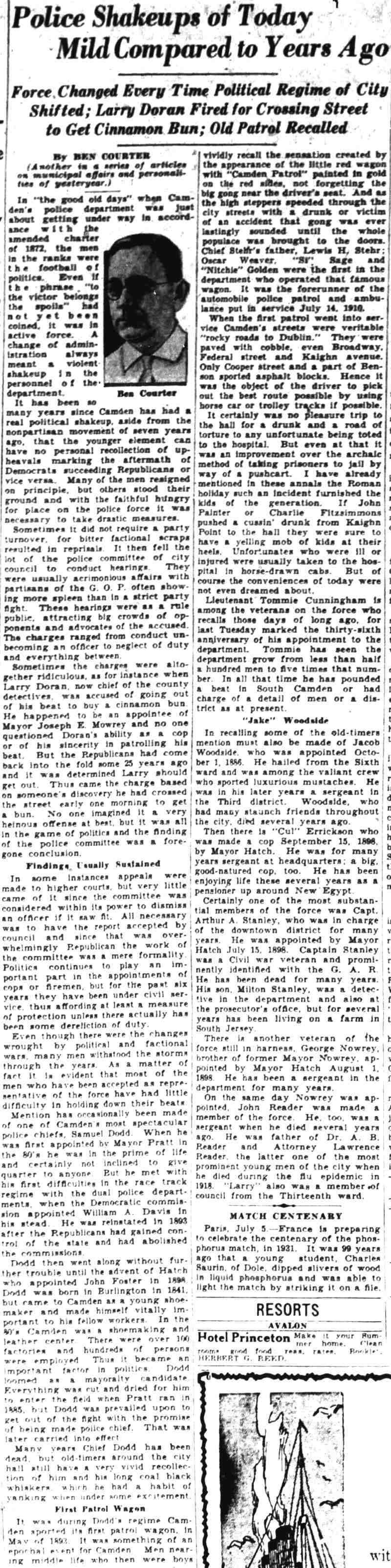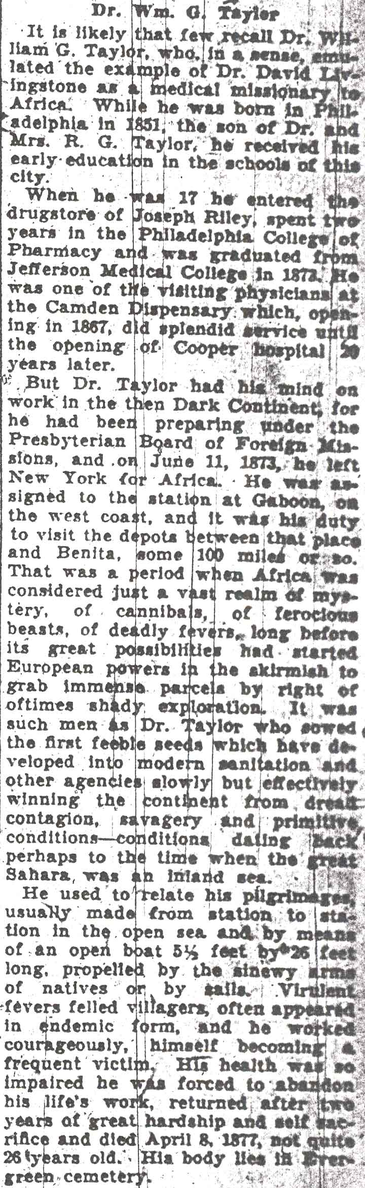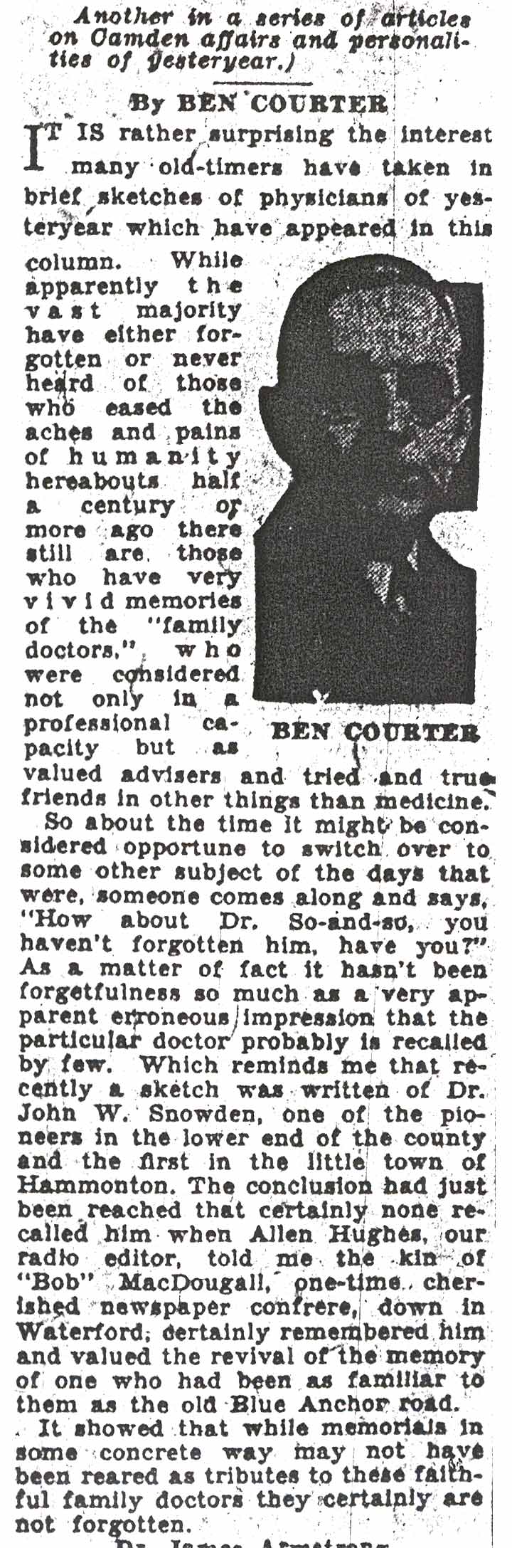 on By BEN COURTER SINCE these annals of medical men in Camden county have appeared, other residents have occasionally asserted this or that physician, their family doctor half a century ago, has been forgotten, "What's the matter with Doc So-and-So?" they have asked, and they have usually added, "He was the best doctor in typhoid" or whatever ailment was probably cured in their own particular household. The particular physician's victory over a malady which prolonged the life of some kin has evidently been handed down through the years as such an outstanding accomplishment that if monuments were in order it is unquestioned Camden would be liberally sprinkled with them, It likewise is certain that when family physicians were more the order of the day in lieu of the present tendency to develop specialists, the medical man's clientele stuck to him through two or three generations and usually placed him on a figurative pedestal at least. Doctor of 50 Years Ago Fifty years ago one of the city's leading physicians was Dr. E. L. B. Godfrey, whose office then was at 621 North Second Street. He was born in Cape May, February 2, 1850. After graduating at the Hightstown Institute, he took up the study of medicine with Dr. E. L. B. Wales, at Cape May. Later he entered Jefferson College, graduating in 1875. serving his term as intern at the Rhode Island Hospital, Providence. He reached here the next year and immediately be-came one of the most active men of his profession, being on the surgical staff when Cooper Hospital was opened in 1887. He also was lecturer on fractures at the Medico-Chi Hos-pital in Philadelphia was major and surgeon of the Sixth Regiment, National Guard served as president of both the city and county societies and contributed authoritative papers to medical journals. One of the early county physicians of Camden was Dr. William H. Iszard, a native of Gloucester County, where he was born in 1842. In 1862 he entered the service of the government as a medical cadet, being stationed at the hospital on Broad Street, Philadelphia, entering Jefferson College the following year. He was considerably hampered through ill health, but after much interruption graduated in 1870. He first located at Elmer, but soon afterward came here and opened an office at 411 North Fourth Street, where he practiced for many years. He was active in political work, being one of the first presidents of the Camden Republican Club, which long had its headquarters on Cooper Street above third, and where many of the national figures in the party were occasional guests. He not only was welcome to any sick room but popular about town because of his affability and general all-around good fellowship. William H. Iszard, the realty man and prominent Elk, is a surviving son. Dr. Iszard died a couple of years ago in his eighties, mourned by many an old-timer. Dr. H. H. Davis Contemporary with him was Dr. Henry H. Davis, whose name is still identified with all that means health protection for Camden's school children. For a generation he was either identified with the Board of Health as its president or the schools as chief medical officer. It was he who was largely responsible for rules guarding young pupils in public schools. Prior to his activities not much attention was paid to ailing youngsters. If they had poor eyesight they were just as liable to be seated far from the blackboard. if their record put them in that position. Not much attention was paid to the cause of their backwardness and if they couldn't see the figures the teacher placed on the board failure was laid to natural dumbness. Not much attention was paid to chronic sore throats, bad teeth or other imperfections, but when Dr. Davis was placed in full charge of the schools he changed all that and children who have passed through the classes in the past quarter of a century owe much to this veteran medical man whom fate ordained should be killed by an auto in his eightieth year. It was through his efforts clinics were established where poor eyesight might be corrected and other deficiencies looked after by the hospitals or dental men. Dr. Davis was born at Crosswicks, August 16, 1848, and became a student of pharmacy in the office of Dr. Alexander Mecray in 1867, entering Jefferson College in the fall of that year. He graduated two years later, courses then being half of the present requirements, and began practice here. For many years he had his office at Third Street and Kaighn Avenue. Two young men whose preceptor he was, Dr. Harry Jarrett and Dr. Rowland I. Haines, afterwards ranked among Camden's leading physicians. Dr. Davis was active in the county society, was a former coroner and for many years identified with many of the city's activities. Dr. Onan B. Gross Arch Street at one time was among Camden's leading residential thoroughfares, although in these days, with most of the old dwellings either gone or in a state of dilapidation that perhaps would be difficult to believe. Half a century ago some of the city's best known professional men resided there, among them Dr. Onan B. Gross, who had his office at 407 Arch Street. In later years he was located at Seventh and Federal Streets. Dr. Gross was a native of Ephrata, Pa., where he was born February 19, 1851. He entered Ephrata Academy but when he was 17 he was thrown on his own resources and apprenticed as a carpenter. He served his time and worked as a journeyman, but he sought a medical career. Through hard work and rigid economy he saved enough to enter the University of Pennsylvania in 1875, graduating three years later. His ability was recognized even then for he was assistant demonstrator in anatomy in the last two years of his course, the first time such an honor had been given one not yet a graduate. In the year of his graduation he received a prize for skill in dissection work. Dr. Gross was county physician three years, president of the county society, a surgeon at Cooper Hospital, member 
