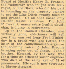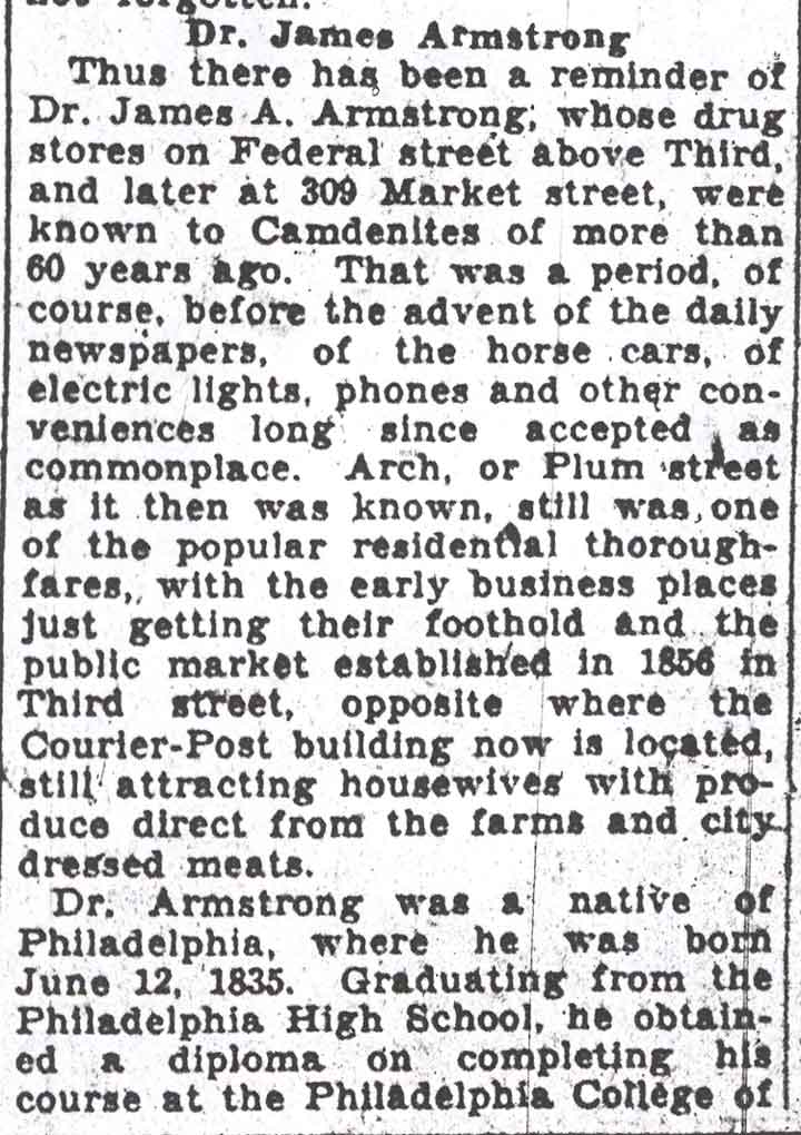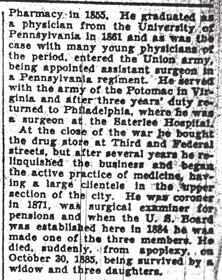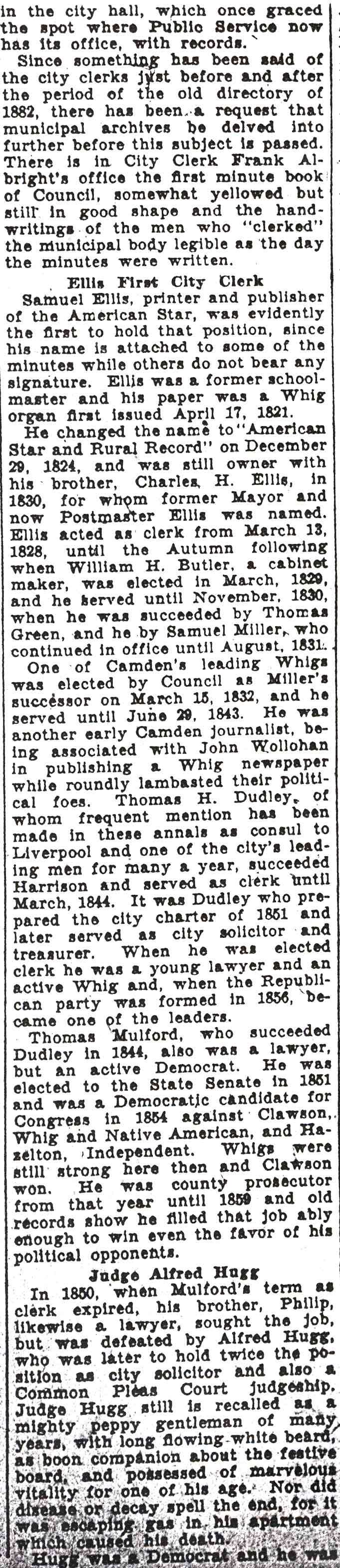 on By BEN COURTER SINCE these annals of medical men in Camden county have appeared, other residents have occasionally asserted this or that physician, their family doctor half a century ago, has been forgotten, "What's the matter with Doc So-and-So?" they have asked, and they have usually added, "He was the best doctor in typhoid" or whatever ailment was probably cured in their own particular household. The particular physician's victory over a malady which prolonged the life of some kin has evidently been handed down through the years as such an outstanding accomplishment that if monuments were in order it is unquestioned Camden would be liberally sprinkled with them, It likewise is certain that when family physicians were more the order of the day in lieu of the present tendency to develop specialists, the medical man's clientele stuck to him through two or three generations and usually placed him on a figurative pedestal at least. Doctor of 50 Years Ago Fifty years ago one of the city's leading physicians was Dr. E. L. B. Godfrey, whose office then was at 621 North Second Street. He was born in Cape May, February 2, 1850. After graduating at the Hightstown Institute, he took up the study of medicine with Dr. E. L. B. Wales, at Cape May. Later he entered Jefferson College, graduating in 1875. serving his term as intern at the Rhode Island Hospital, Providence. He reached here the next year and immediately be-came one of the most active men of his profession, being on the surgical staff when Cooper Hospital was opened in 1887. He also was lecturer on fractures at the Medico-Chi Hos-pital in Philadelphia was major and surgeon of the Sixth Regiment, National Guard served as president of both the city and county societies and contributed authoritative papers to medical journals. One of the early county physicians of Camden was Dr. William H. Iszard, a native of Gloucester County, where he was born in 1842. In 1862 he entered the service of the government as a medical cadet, being stationed at the hospital on Broad Street, Philadelphia, entering Jefferson College the following year. He was considerably hampered through ill health, but after much interruption graduated in 1870. He first located at Elmer, but soon afterward came here and opened an office at 411 North Fourth Street, where he practiced for many years. He was active in political work, being one of the first presidents of the Camden Republican Club, which long had its headquarters on Cooper Street above third, and where many of the national figures in the party were occasional guests. He not only was welcome to any sick room but popular about town because of his affability and general all-around good fellowship. William H. Iszard, the realty man and prominent Elk, is a surviving son. Dr. Iszard died a couple of years ago in his eighties, mourned by many an old-timer. Dr. H. H. Davis Contemporary with him was Dr. Henry H. Davis, whose name is still identified with all that means health protection for Camden's school children. For a generation he was either identified with the Board of Health as its president or the schools as chief medical officer. It was he who was largely responsible for rules guarding young pupils in public schools. Prior to his activities not much attention was paid to ailing youngsters. If they had poor eyesight they were just as liable to be seated far from the blackboard. if their record put them in that position. Not much attention was paid to the cause of their backwardness and if they couldn't see the figures the teacher placed on the board failure was laid to natural dumbness. Not much attention was paid to chronic sore throats, bad teeth or other imperfections, but when Dr. Davis was placed in full charge of the schools he changed all that and children who have passed through the classes in the past quarter of a century owe much to this veteran medical man whom fate ordained should be killed by an auto in his eightieth year. It was through his efforts clinics were established where poor eyesight might be corrected and other deficiencies looked after by the hospitals or dental men. Dr. Davis was born at Crosswicks, August 16, 1848, and became a student of pharmacy in the office of Dr. Alexander Mecray in 1867, entering Jefferson College in the fall of that year. He graduated two years later, courses then being half of the present requirements, and began practice here. For many years he had his office at Third Street and Kaighn Avenue. Two young men whose preceptor he was, Dr. Harry Jarrett and Dr. Rowland I. Haines, afterwards ranked among Camden's leading physicians. Dr. Davis was active in the county society, was a former coroner and for many years identified with many of the city's activities. Dr. Onan B. Gross Arch Street at one time was among Camden's leading residential thoroughfares, although in these days, with most of the old dwellings either gone or in a state of dilapidation that perhaps would be difficult to believe. Half a century ago some of the city's best known professional men resided there, among them Dr. Onan B. Gross, who had his office at 407 Arch Street. In later years he was located at Seventh and Federal Streets. Dr. Gross was a native of Ephrata, Pa., where he was born February 19, 1851. He entered Ephrata Academy but when he was 17 he was thrown on his own resources and apprenticed as a carpenter. He served his time and worked as a journeyman, but he sought a medical career. Through hard work and rigid economy he saved enough to enter the University of Pennsylvania in 1875, graduating three years later. His ability was recognized even then for he was assistant demonstrator in anatomy in the last two years of his course, the first time such an honor had been given one not yet a graduate. In the year of his graduation he received a prize for skill in dissection work. Dr. Gross was county physician three years, president of the county society, a surgeon at Cooper Hospital, member 