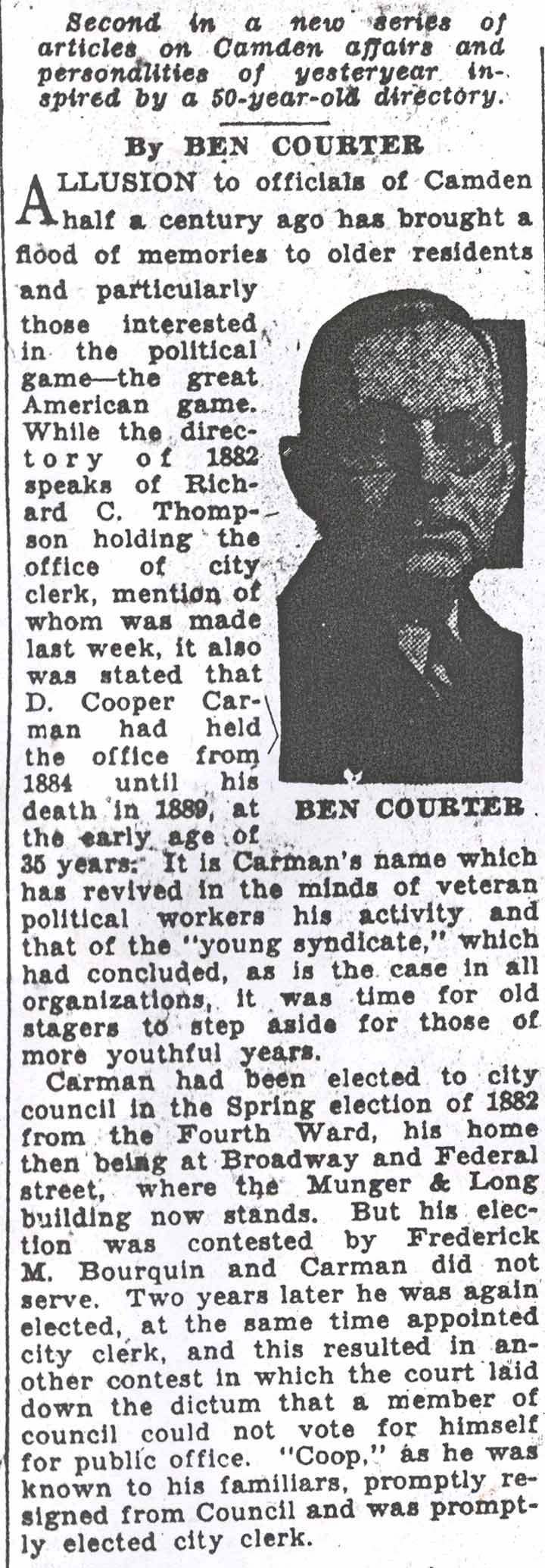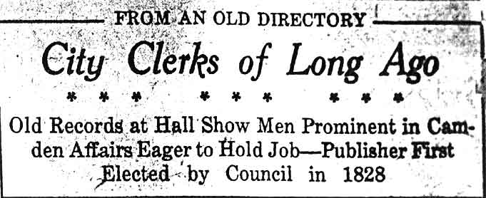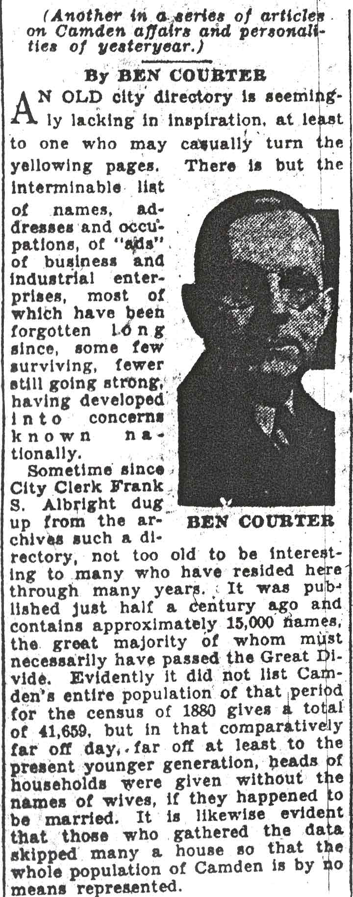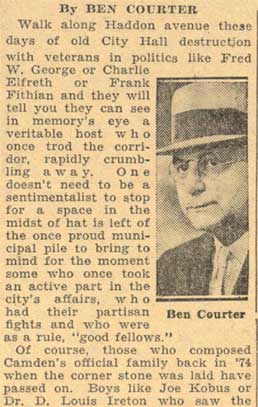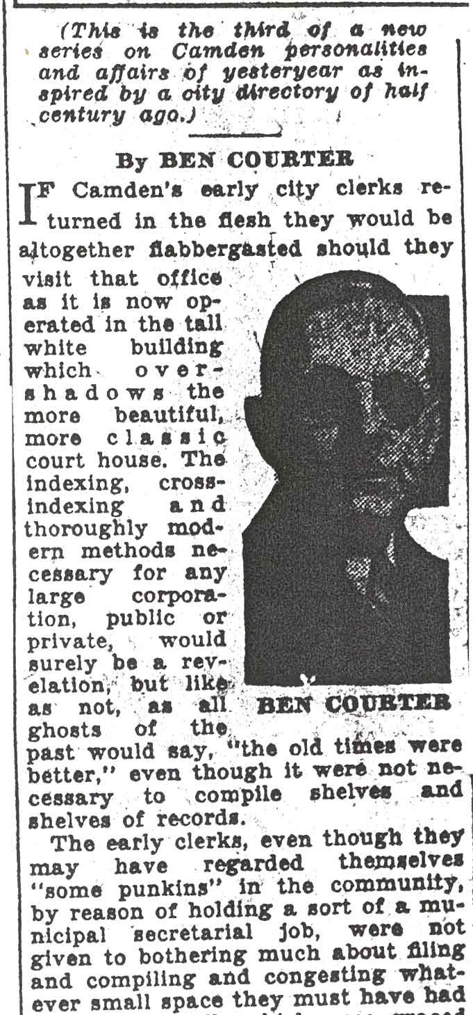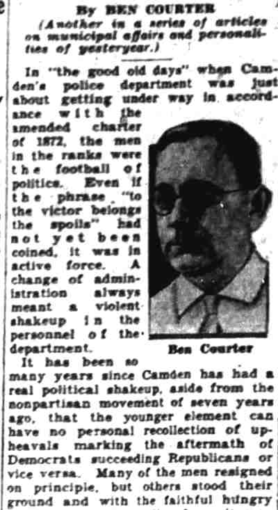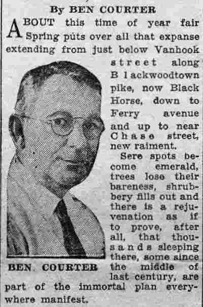 BENJAMIN WILLIAM COURTER was born in Camden NJ on June 6, 1877 to John Dodd and Laura Braker Courter. Grandfather Benjamin Braker was well-known in Camden as a newspaperman and as a Justice of the Peace. Ben Courter's early years were spent in Gloucester City NJ, where his father in 1880 was a grocer. John Dodd Courter would soon embark on a newspaper career that would last until his death in 1920. He wrote for several Philadelphia papers and last worked for the Daily Courier in Camden, and was noted as an outdoor columnist, as was his son. After marrying Sarah "Sadie" Emily Emmerson in Camden on August 23, 1898, . Benjamin Courter followed his father into journalism. Beginning his career in 1900, he covered news for several Philadelphia newspapers before working on the old Camden Post-Telegram, which merged with the Daily Courier to become the Courier-Post in 1926. In the words of grandson "Duke" Courter, "He continued the tradition and worked as an outdoor columnist with the Courier-Post for 34 years." By 1920, Benjamin W. Courter had purchased a home at 203 Evergreen Avenue in Woodlynne NJ. Ben Courter also began writing about days gone by in Camden. When veteran reporter Charles Leo "Mack" McKeone died in December of 1927, his extremely popular "The Peppery Pot by Mack" died with him. Ben Courter was tapped to fill some extremely large shoes, which he did with the "Along Memory Lane" column and other articles. Benjamin W. Courter died in harness, seated at his desk at the Courier-Post building in Camden on November 8, 1934. He had completed another column devoted to Camden's history at home the night before, which was published on November 20. He was survived by his wife and four children, Harold E., Marion E., Elmer R., and John D. Courter. John D. Courter and grandson Robert "Duke" Courter would also go on to long careers at the Courier-Post . |