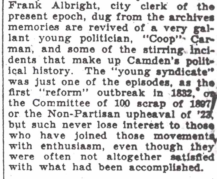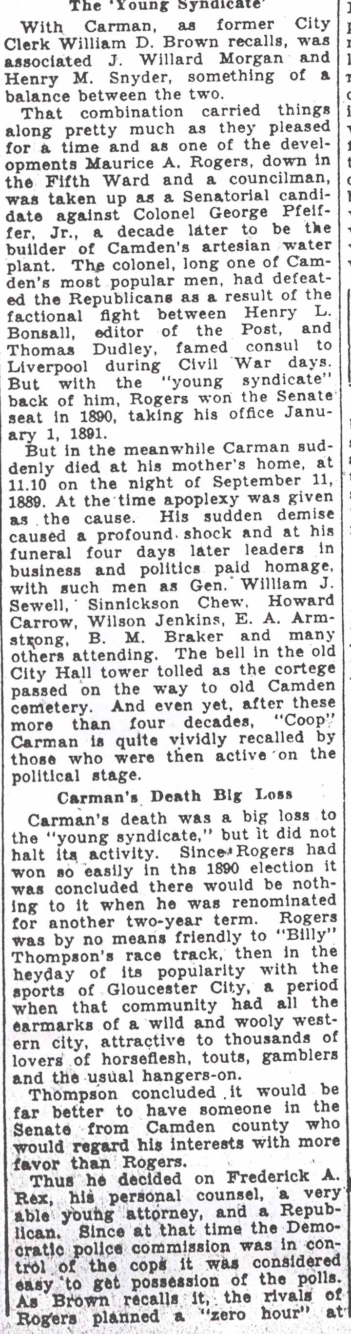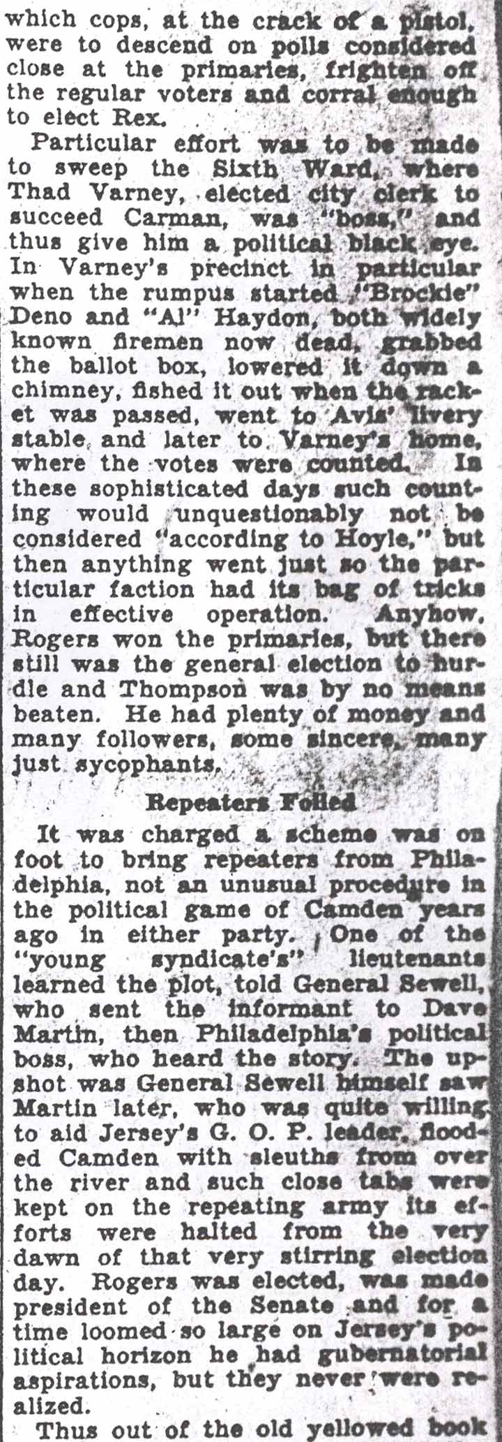 on By BEN COURTER Rival factions in the political conventions of long ago were more bitter toward one another than toward the common foe. So-called "rump" conventions were by no means exceptions. By "rump" was meant mereIy those who refused to play with the regulars and who set up the nominations, as did the Bull Moose on the national scale in the historic scrap of 1912 which resulted in the three-cornered battle of Wilson, Roosevelt and Taft, giving the Princeton professor the start that was to make him a world figure. Factions we still have, of course, and it is quite proper, since too much regularity often breeds party decay. But present-day political methods are certainly lacking in the spectacular rumpuses that stirred the rank and file in the period when delegates met and made their nominations. In a recent article allusion was made to the Democratic convention of September 20, 1878, when Nathan T. Stratton, of Millville, was nominated for Congress by the Democrats in the midst of downright fisticuffs, when "liar" and "hypocrite" and worse was hurled about the hall. Lest it may be assumed the party of Jefferson and Jackson only was given to such methods, it is fitting to give a picture on the other side of the political house. Dr. William H. Iszard's inexhaustible scrap book, loaned me by his son, former Assemblyman Iszard comes across with a copy of a tabloid political sheet, "The True Republican," which gives a recital of a battle royal in the G.O.P. ranks which will be of interest to some old-timers I know are still about. Rival Conventions That was the convention to nominate a sheriff called at Gloucester City Hall on Saturday, October 8, 1881, where we find the redoubtable Colonel James Matlack Scovel once more a moving factor, but this time in the ranks of the "regular Republicans" or at least so they called themselves as opposed to the "rump" set up by a rival group. Christopher J. Mines, long Fifth ward leader and later sheriff, apparently had been selected as temporary chairman with William A. Husted, who died last year well in his 70's, as secretary. But when that part of the delegation marched up to city hall, like the famed king's horses- they marched down again. As a matter of fact, not much marching was done in the hall- for it was asserted by the "true Republicans" that when they essayed to enter the portals they found Colonel Scovel and Henry M. Jewett, father of Harry Jewett, a Camden newspaperman of the long ago and for years later Jersey editor of the Inquirer, in command. More, it was charged "people representing the worst elements of society" were on guard and presented a phalanx which even the huskies of the opposing force could not break. Mines was strong-armed by the minions of Scovel and Jewett and there was so much hooting and yelling and cussin' that the "true" part of the outfit walked out, all 29 of them, over to Moss' hall where they proceeded to carryon their convention to their own taste. And all 29 of these valiant Republicans voted for Eli B. Morgan as their candidate for sheriff. You old timers will be interested in recalling these delegates who refused to kowtow to 'Colonel Jim.' In the Third ward there was James M. Lane, Charles S. Cotting and George Martin, in the Fourth, Husted, the Sixth, C. C. Smith, Thad Varney, Charles A. Sawyer: in the Seventh, Stephen Walters, Charles Lederman, William Simpson; in Gloucester, John W. Wright, David Anderson, Frank Mills, Robert Lafferty, Richard Allen, Jesse Daisey, Samuel Wood; in Haddon, Charles M. Macready, Elwood J. Haines: in Delaware, William Brick, William Graff, Isaac Coles; in Merchantville, Matthias Homer, William Naylor, and in Center, James Davis, Garrett Patton and Gilbert Shaw. Hot Statement These "true Republicans" in a statement to the party rank and file, under the Algeresque title of "Now or Never," scathingly said: "It becomes the duty of every Republican voter of Camden county, who has the future interest of the party at heart, to administer a severe and lasting rebuke to all candidates who employ the element and encourage the means that were used in controlling the Sheriff's convention at City Hall, Gloucester City. It discounted anything within the memory of the oldest Democrat inhabitant. What with Col. Joseph Nichols urging the crowd to go elsewhere and nominate Gibbs, and the immaculate Billy Warner of the Fifth ward ordering them to burst the door in, coupled with the commanding voice of that great patriot and life-long Republican, James M. Scovel, alias Mountain Partridge, together with the curses and threats from John Furey, Jack Quigley, Pud Young, Bill Derr, "Tar Heel" Jim Hayes, the able city solicitor, and a gang of Philadelphia roughs, a beautiful spectacle was presented." The "Gibbs" mentioned was Theodore B. Gibbs who long lived in the white mansion on the banks of Clementon lake and whose ancient grist mills ground the grain for farmers from miles around. None in the county was held in higher esteem and in later years most of the valiant 29 were among his closest friends, unnecessary proof the political animosities are, as a rule, not very enduring. Gibbs was nominated by the "regular" Convention which ousted the 29 and a mighty hot shrievalty campaign ended on November 10 with his ejection, in spite of the "now or never" demand of his opponents headed by Eli Morgan. The latter was a real estate man, son of Randall Morgan, elected sheriff by a whisker over "Ham" Bitten in 1869, and brother of J. Willard Morgan, long a Republican chieftain. It was the elder Morgan who defeated Bitten, a rough and ready character nominated as a joke, by a narrow squeak. In the shrievalty scrap of 1881. Gibbs received 5381 and Morgan, 1189. Angus Camerson, the Democratic candidate was given 4450 votes. Nor did the "true" nominees for coroner fare any better. Sam Bennett, William Thompson and Alexander Powell being defeated by 'Doc' John D. Leckner, Jacob Justice and William Duble. But the 