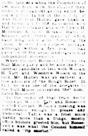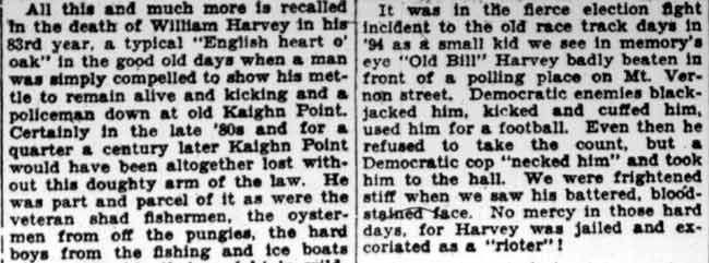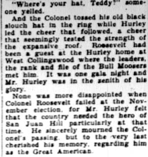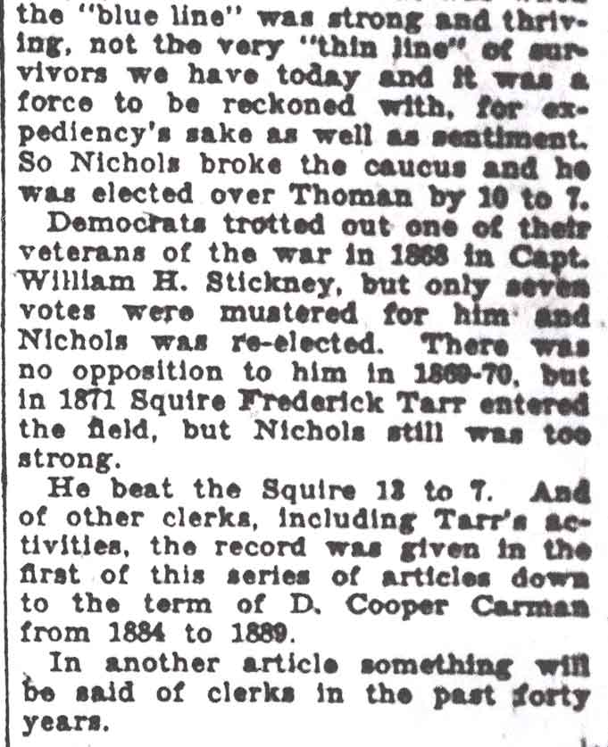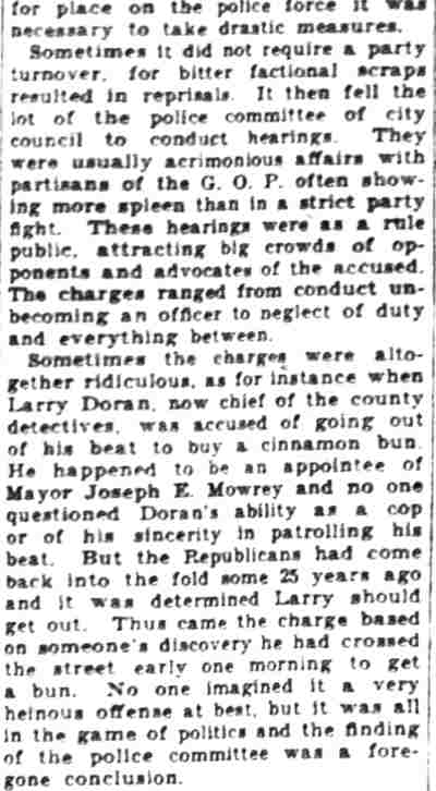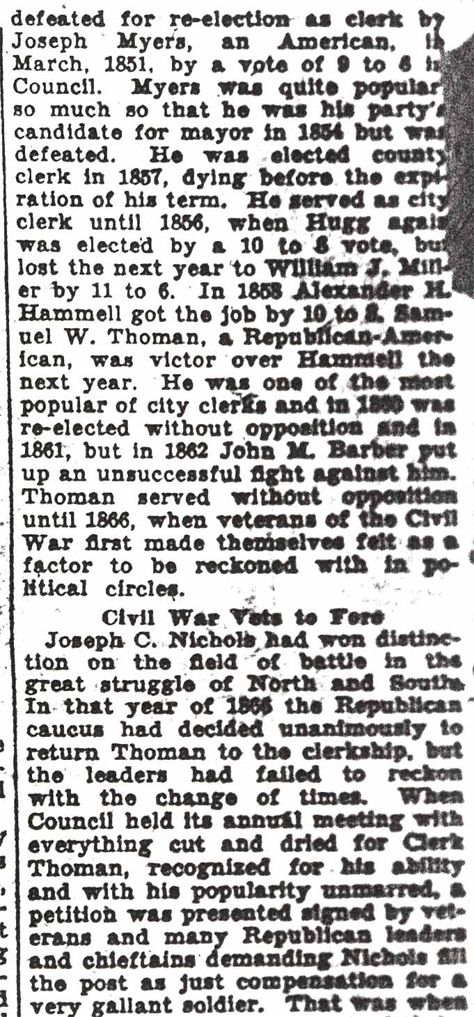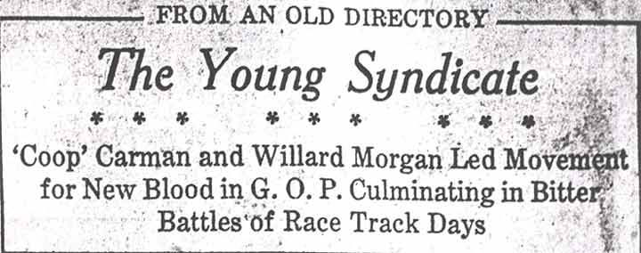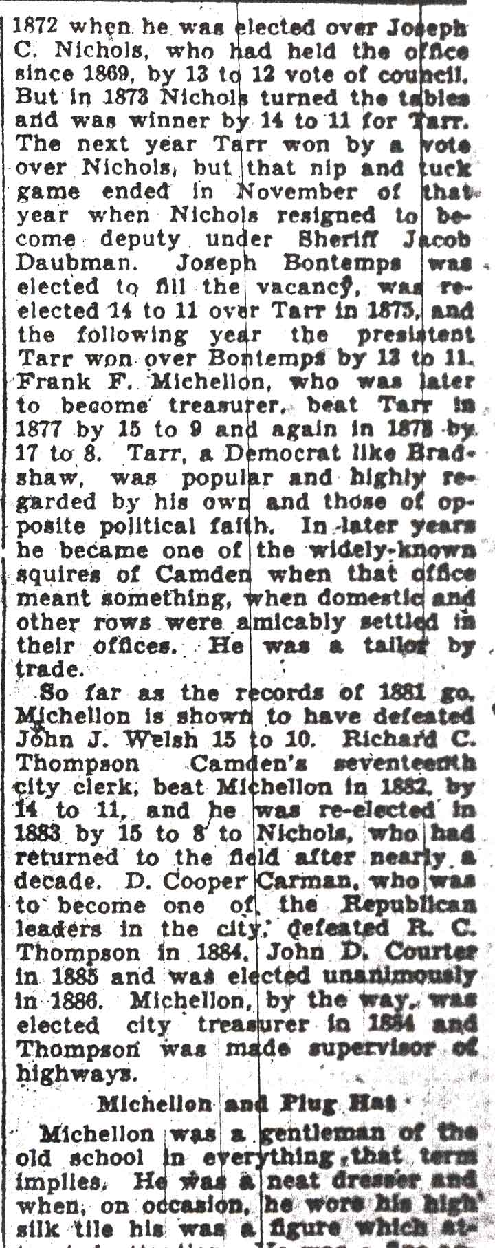 on By BEN COURTER Rival factions in the political conventions of long ago were more bitter toward one another than toward the common foe. So-called "rump" conventions were by no means exceptions. By "rump" was meant mereIy those who refused to play with the regulars and who set up the nominations, as did the Bull Moose on the national scale in the historic scrap of 1912 which resulted in the three-cornered battle of Wilson, Roosevelt and Taft, giving the Princeton professor the start that was to make him a world figure. Factions we still have, of course, and it is quite proper, since too much regularity often breeds party decay. But present-day political methods are certainly lacking in the spectacular rumpuses that stirred the rank and file in the period when delegates met and made their nominations. In a recent article allusion was made to the Democratic convention of September 20, 1878, when Nathan T. Stratton, of Millville, was nominated for Congress by the Democrats in the midst of downright fisticuffs, when "liar" and "hypocrite" and worse was hurled about the hall. Lest it may be assumed the party of Jefferson and Jackson only was given to such methods, it is fitting to give a picture on the other side of the political house. Dr. William H. Iszard's inexhaustible scrap book, loaned me by his son, former Assemblyman Iszard comes across with a copy of a tabloid political sheet, "The True Republican," which gives a recital of a battle royal in the G.O.P. ranks which will be of interest to some old-timers I know are still about. Rival Conventions That was the convention to nominate a sheriff called at Gloucester City Hall on Saturday, October 8, 1881, where we find the redoubtable Colonel James Matlack Scovel once more a moving factor, but this time in the ranks of the "regular Republicans" or at least so they called themselves as opposed to the "rump" set up by a rival group. Christopher J. Mines, long Fifth ward leader and later sheriff, apparently had been selected as temporary chairman with William A. Husted, who died last year well in his 70's, as secretary. But when that part of the delegation marched up to city hall, like the famed king's horses- they marched down again. As a matter of fact, not much marching was done in the hall- for it was asserted by the "true Republicans" that when they essayed to enter the portals they found Colonel Scovel and Henry M. Jewett, father of Harry Jewett, a Camden newspaperman of the long ago and for years later Jersey editor of the Inquirer, in command. More, it was charged "people representing the worst elements of society" were on guard and presented a phalanx which even the huskies of the opposing force could not break. Mines was strong-armed by the minions of Scovel and Jewett and there was so much hooting and yelling and cussin' that the "true" part of the outfit walked out, all 29 of them, over to Moss' hall where they proceeded to carryon their convention to their own taste. And all 29 of these valiant Republicans voted for Eli B. Morgan as their candidate for sheriff. You old timers will be interested in recalling these delegates who refused to kowtow to 'Colonel Jim.' In the Third ward there was James M. Lane, Charles S. Cotting and George Martin, in the Fourth, Husted, the Sixth, C. C. Smith, Thad Varney, Charles A. Sawyer: in the Seventh, Stephen Walters, Charles Lederman, William Simpson; in Gloucester, John W. Wright, David Anderson, Frank Mills, Robert Lafferty, Richard Allen, Jesse Daisey, Samuel Wood; in Haddon, Charles M. Macready, Elwood J. Haines: in Delaware, William Brick, William Graff, Isaac Coles; in Merchantville, Matthias Homer, William Naylor, and in Center, James Davis, Garrett Patton and Gilbert Shaw. Hot Statement These "true Republicans" in a statement to the party rank and file, under the Algeresque title of "Now or Never," scathingly said: "It becomes the duty of every Republican voter of Camden county, who has the future interest of the party at heart, to administer a severe and lasting rebuke to all candidates who employ the element and encourage the means that were used in controlling the Sheriff's convention at City Hall, Gloucester City. It discounted anything within the memory of the oldest Democrat inhabitant. What with Col. Joseph Nichols urging the crowd to go elsewhere and nominate Gibbs, and the immaculate Billy Warner of the Fifth ward ordering them to burst the door in, coupled with the commanding voice of that great patriot and life-long Republican, James M. Scovel, alias Mountain Partridge, together with the curses and threats from John Furey, Jack Quigley, Pud Young, Bill Derr, "Tar Heel" Jim Hayes, the able city solicitor, and a gang of Philadelphia roughs, a beautiful spectacle was presented." The "Gibbs" mentioned was Theodore B. Gibbs who long lived in the white mansion on the banks of Clementon lake and whose ancient grist mills ground the grain for farmers from miles around. None in the county was held in higher esteem and in later years most of the valiant 29 were among his closest friends, unnecessary proof the political animosities are, as a rule, not very enduring. Gibbs was nominated by the "regular" Convention which ousted the 29 and a mighty hot shrievalty campaign ended on November 10 with his ejection, in spite of the "now or never" demand of his opponents headed by Eli Morgan. The latter was a real estate man, son of Randall Morgan, elected sheriff by a whisker over "Ham" Bitten in 1869, and brother of J. Willard Morgan, long a Republican chieftain. It was the elder Morgan who defeated Bitten, a rough and ready character nominated as a joke, by a narrow squeak. In the shrievalty scrap of 1881. Gibbs received 5381 and Morgan, 1189. Angus Camerson, the Democratic candidate was given 4450 votes. Nor did the "true" nominees for coroner fare any better. Sam Bennett, William Thompson and Alexander Powell being defeated by 'Doc' John D. Leckner, Jacob Justice and William Duble. But the 