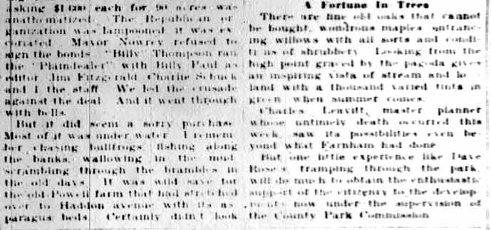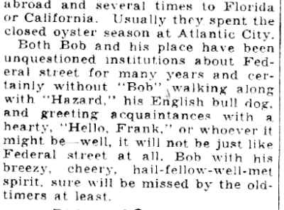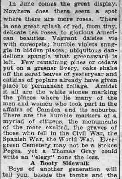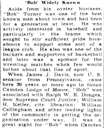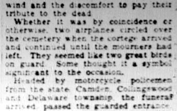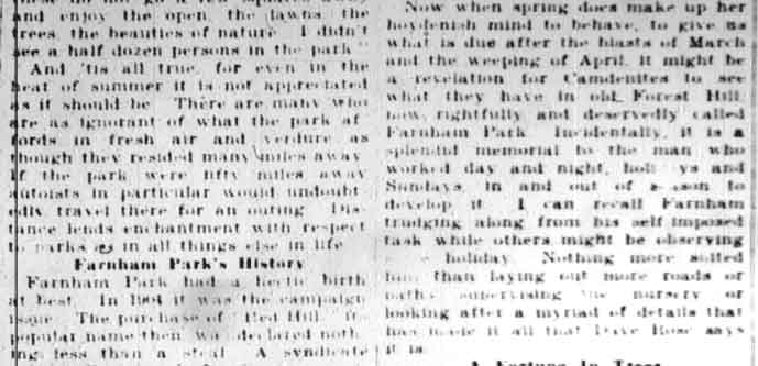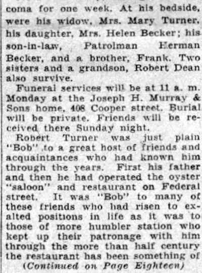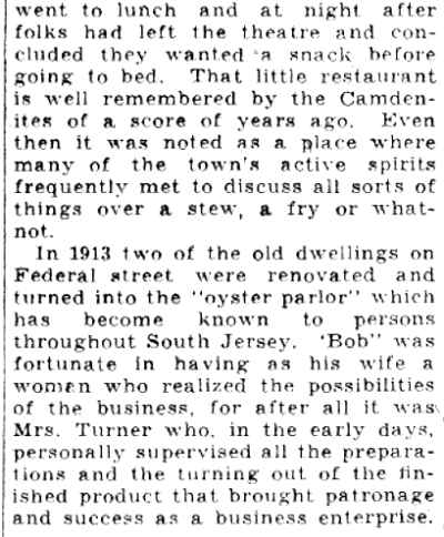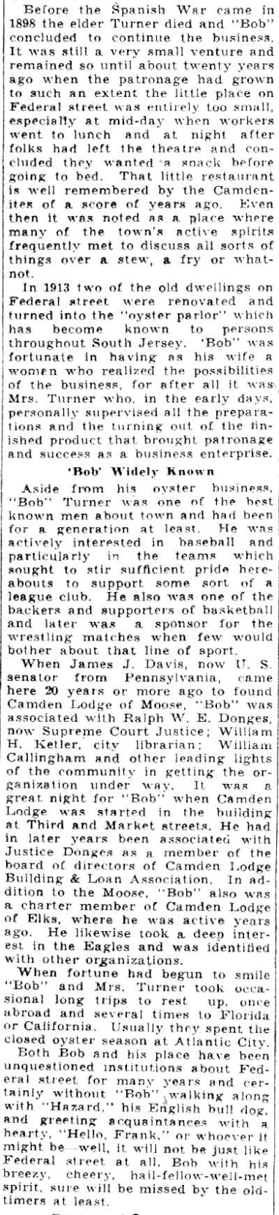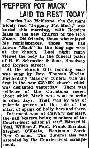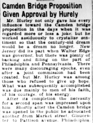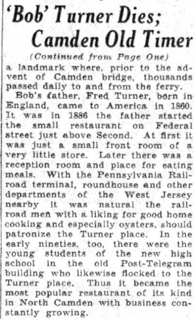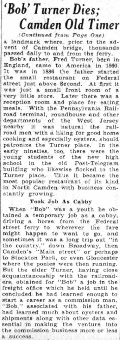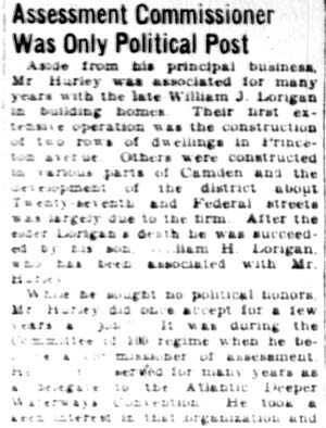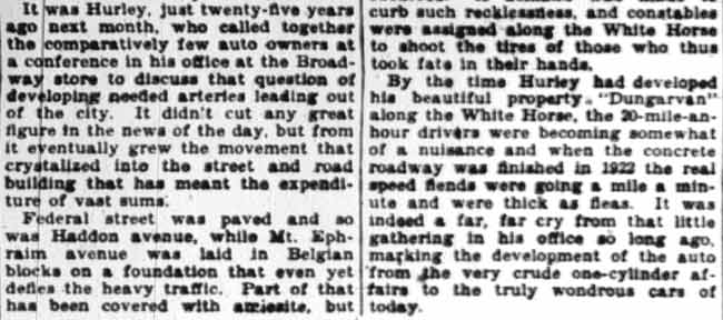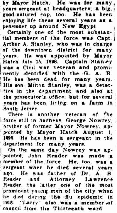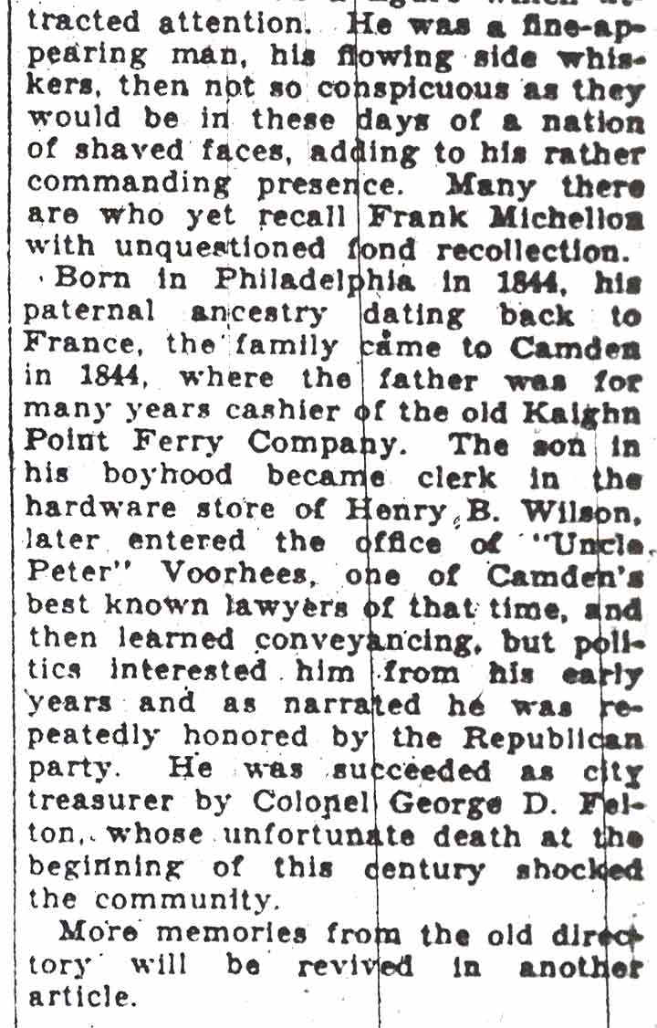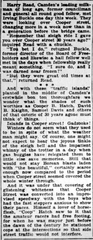 Old Centreville Families WHEN a larger community annexes an adjoining district the newer area is generally regarded, for a time at least, as a step-child. Older residents of East Camden will bear out that truism when they recall how difficult it was to obtain improvements. Years before, Newton Township which became part of Camden, had had the same experience. Under such circumstances, it requires tireless energy on the part of leading men to get what their district needs. Demands often go unheeded unless the community is fortunate in having those of spirit who insist on street improvements, water extension, lighting facilities and schools. That was more in evidence half a century ago than now, of course, for Camden itself was little more than a large village. Down in Centreville there were men who looked after the interests of their constituents, who slowly but surely obtained, improvements and who insisted on being recognized by the powers that be. No one may think of old Centreville without thought of Dr. John W. Donges, whose value to not only that section but Camden at large, has been expatiated upon in these annals. He was not only a leading physician, with a practice extending into Camden, but a leader in many civic movements, and any article on that era would be incomplete without allusion again to the doctor whose services as a real family physician are part of the traditions of many old families. Came Here In 1872 He came here in 1872 from Schuylkill County, Pennsylvania, when his health was affected by overwork through loyalty to his patients. He bought the drugstore at Ferry Avenue and Broadway, remaining there for many years. It was there Supreme Court Justice Ralph W. E. Donges spent his boyhood. There, too, Dr. Clarence B. Donges and Attorney Raymond Donges were boys. Grant E. Kirk, clerk in his store, later becoming a physician and for several years a member of council and at one time being prominently boomed for mayor, married their sister. Dr. Donges was elected to council in 1878 on the Democratic ticket, itself an evidence of the high regard in which he was held, for the Eighth Ward generally was rock-ribbed Republican. Until the early part of this century he resided in his old place, but later went to broadway and Clinton Streets. In later years, after he had retired, he was city assessor, "just to keep busy." He died a few years ago, well in his 80s, mourned by a great host of Camdenites. There was another widely known Centreville family of the old days, that of Samuel Mills, who had his own abattoir at broadway and Jackson Street, where city-dressed meats were provided before the days of car refrigeration brought supplies from the great packing places in Chicago. His son, Charlie, was long a member of the Board of Education, while another, William, was a city councilman. Edward Milis, another son, was excise commissioner 35 years ago in the days when there was plenty of trouble with Sunday sellers. Cornelius Schepperkotter was a factor in politics down that way, too, having a grocery store on ferry avenue at Ninth, later moving to the southwest corner when the Charles Sumner School was built. That school was torn down two years ago for the recreation center. Schepperkotter was a member of the old Board of Public Instruction in the late 90's, named by Mayor Cooper B. Hatch. In later years and until his death, he was superintendent of Evergreen Cemetery. He was father of Mrs. Frank S. Albright, wife of City Clerk Albright. Frank Covely Shortly after the New York shipyard was opened, there moved to the "Hill" Frank D. L. Covely, who became a joiner and for years was foreman of the joiner shop. He was widely known as a secret society man and also as an effective campaign speaker for the G. O. P. He was a member of the Board of Education. He sought to go to council, but that was at the time kirk was a power in the ward. Covely laughingly used to tell of a meeting all set for him from which all save the colored folk were drawn away through strategy of his party opponents. But for ten years he was a member of the Board of Recreation Commissioners. That movement owed much to his work. Nor did he forget his colored friends, for he had a playground established for them at ferry avenue and Phillips Street and the large one [Staley Park- pmc] at Seventh and Jefferson streets. Long afterward that was named for another city official, but Covely's friends said it should have been for him, as a monument to his services for the boys and girls of Centreville. He died a few years ago at Bellmawr in his 70s, after a hectic experience as a chicken raiser at Port Norris. There, too, was William Dorrell, superjntendent of the old "Narrow Guage" who was one of the leading spirits in the paving of Broadway, nearly 60 years ago the big issue of that section. He lived in a house along the railroad still standing, as the hospital and dispensary of the shipyard. Mention has been made of the Ferrises, the Helmbolds, the Yeagers, of Squire James D. Chester and Squire F. Joseph Rouh. There was also William O. Thompson, the leading contractor down that way for many years and Theodore Tiedeken, who established the wagon works on Van Hook Street, Martin Ewe, who had the hotel at Broadway and Emerald, and down the street a bit James Croker, who operated Tammany Hall. Forty years ago there was one of the best young athletes of the city, Thomas Nicholas, now retired Camden fire chief. He was down in old no. 3 with Bill Rose, long a fire captain, Bill Miller, Al James, Sam Lodge, gus dold and John Ware. Many of these old timers have passed on, but others are still in the flesh but scattered to all parts of the city but it may be said the survivors look back on the days that were down there in Centreville with an interest that does not dim with the passing years. |