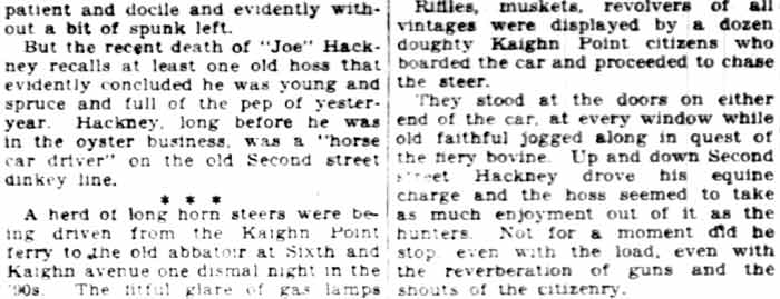 The Fuhrmans, Auerbachs, Lichtensteins were among the first I recall. Many others followed; especially from the Russian Polish district where life was hard and oppression severe. Came the immigrant wave from South Italy whose descendants long since have taken possession of the district spreading from third and Pine, once the stronghold of English, German, and Irish families. In a police census a quarter of a century ago it developed that the Fifth Ward could boast representatives from every nation on the face of the globe, even to a Finlander, some Turks with Japs and Chinese commonplace.