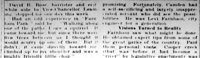 Keeping Chimneys Clean COMPARING Camden's fire-fighting equipment of today with what the city had when it was incorporated, 103 years ago, the wonder is that some of the fires did not wipe out the tiny community. With their pumpers, chemicals and water mains, the average suburb an town is pro-tected like a metropolis when we consider the methods in vogue a century ago. Fire ever has been man's most implacable foe, and eve yet it is merely a matter of degree -from barbarian ancestors and their rude thatched shacks, to modem skyscraper as to the terror it inspires. Camden, in the late 20s of the last century, was merely a clutter of tiny dwellings, only the more prosperous citizenry such as the Coopers and Kaighns having brick domiciles graced with attics. It was thus in keeping with the times to have thought first for safety from the fire demon when City Council held its first session, April 11, 1828. That was by way, of an ordinance directed against those inclined to be careless and let their chimneys collect through the years, a great mass of soot. There were those who kept their chimneys clean as the proverbial whistle, first, so the fire would draw, and again to remove the fire hazard, But many apparently, took pot luck and let things go with little thought of what might happen until it did- oft-times in the dead of night with long tongues of flames wiping out their humble domicile. Wood Exclusively Used Electricity was little more than the mysterious force Ben Franklin had toyed with over the Delaware. Coal still was to be brought from its carboniferous beds in Pennsylvania. It had not even been proposed as "stones that would burn and give heat." Oil came from whales and such and was used sparingly on new fangled mysteries called machinery. So the thick, clumps of trees here about were hewed down for heat in winter and to cook the meals. It was that constant use of wood that filled the chimneys with soot and soot evidently was most of the cause of fire. When a fire started in Camden village it was a serious affair. If it wasn't caught in the nick of time the house burned to the ground. So council passed its first ordinance to help the boys of old Perseverance in keeping down the fire record although in those days there were no records kept, of course. That first company, by the way, was on Second Street above Market, about where the National State Bank first built. The little frame shack was still there in the 70's when the bank enlarged its building and tore it down, the company meanwhile having taken its quarters to Third Street. But getting back to the ordinance of council, it required the thorough sweeping of every chimney at least once in three months. If a sweep tried the short cut to earning his money by burning out a chimney he was fined $1 because that method was declared to endanger surrounding property. The sweep was supposed to get into the chimney or at least sweep it in regulation fashion and not "cut corners," as some persons have a habit of doing whether it's sweeping chimneys or building a house. That part of the ordinance is interesting for it provides "that if any person from or after the first day of May next, ensuing, shall burn his, her or their chimney, or suffer the same to burn or blaze out of the top thereof, unless the roof of the house thereof is covered with snow, or during the time of a storm of rain or snow, every such person shall forfeit and pay the sum of one dollar." If a chimney should take fire the house owner was required to prove that it had been properly swept out within three months. Further, it was provided if such a chimney burst into flame after it had been swept out the chimney sweep was to forfeit a dollar. That evidently was due to the determination of Laning, Cowperthwaite, Sloan and Lawrence, the city fathers, to make more and better chimney sweeps and to aid the Perseverance boys in staying the ravages of the flaming foe. Outstanding Fireman And if any of the boys of the present generation imagine they have the niftiest apparatus hereabouts; with all their compound engines, extension ladders and what not, they have nothing on Samuel D. Elfreth, who "ran" with old Perseverance so soon as he came to Camden, in 1824. Old annals relate, he was always on the spot when "she" was needed, meaning the hand engine, and was regarded as the outstanding fireman of Camden. In 1882 my grandfather wrote in the Courier that Elfreth, although verging on 80, was then still one of the most active volunteer firemen in Camden. He then resided within the shadow of his beloved old company and was filled with reminiscences of the days when he ran with the boys. His son, Samuel (S. Elfreth), then was chief of the paid fire department as he was in later years until his death some 15 years ago. Charles F. Elfreth, a veteran attache of the city's finance department, is a grandson of the first Elfreth, a nephew of the late chief. Those old ordinances relative to keeping chimneys clean seem amusing now, but they were vitally important then. They were, in fact, the very beginning of the present day system of keeping down fire losses by way of every possible method in alarms, in equipment, in man efficiency. It is from such humble beginnings that have evolved the methods in battling blazes in skyscrapers, in extensive plants, in keeping tabs on the very last thing in conquering the foe ever ready, and seemingly willing, to raze the works of man. |