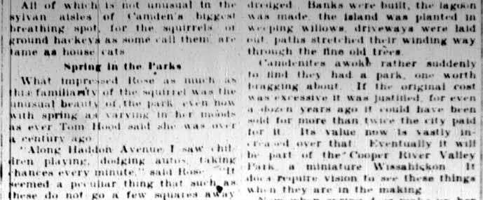 Old Eighth Street swamp is dwindling. Not much is left only a small area of Eighth Street east of the Pennsy tracks and north of Van Hook Street. Combination of civic-realty activity spelling the doom of the morass that once extended near the present eastern boundaries of the West Jersey Hospital. It seems odd to those familiar with the acres of swampy wilderness of yesteryear to see the labor army pushing through streets where the frog chorus once sounded its dulcet strains, where the water moccasin once slithered through tussock and reed, where vagrant bobolinks and red-winged blackies stopped for tragic rest. But it is a fact the cherished dream of many a South Camdenite of the long ago who hoped to see the day when the swamp would be but a memory. Those new streets, actually extensions of connecting links of thoroughfares already long on the city map, are expected to result in the development of that area, bring something suggestive of a new community. Long ago the swamp extended from the river to near Mt. Ephraim Avenue. It was called Eighth Street Swamp mainly for convenience because that street was one of the many cut off by the expanse of low ground. Line Ditch was the feeder. The late Aaron Ward, one of Camden’s prominent contractors years ago, told me that barges loaded with brick were at one time floated up to where the Pennsy tracks now are located. That stream, subject of many a malediction in later years when industrial progress had transformed into a semi-liquid abomination then was clean and clear as crystal. It was fed by many a spring, and when the flood tide of the Delaware came in the water spread over the country sometimes forming a lake of many acres. There were times when old Centerville seemed utterly isolated from Camden, when Ferry avenue, Broadway, and the railroad tracks were the only narrow causeways between the two sections. Back toward Mt. Ephraim Avenue, then but a yellow gravelly ribbon stretching down to Mt. Ephraim and Blackwood, were the “bluffs”, relatively high ground usually covered by small growths. These have been graded, most of the material now resting as fill along the Crescent Boulevard. No one man dreamed of filling in the swampy expanse. For a quarter of a century, the Board of Health discussed, re-discussed, and again discussed clearing up the morass. Abutting property owners when they could be found were cited to show cause why they didn’t fill their lowland. And in more than one case the Board was told to take the land and so it if the city was so anxious. Eventually they were taken at their own invitation and the city did much filling and grading and built the $80,000 sewer that rid the section of Line Ditch. Thus the Ditch disappeared. It was the first real step towards excavation, toward what is done today in the construction of streets, in grading to make way for homes, in creation of a community that will figuratively weld South Camden and its ancient rival Centerville, now the Eighth Ward. |