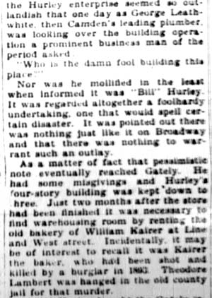 "Wonder if they're going to take down the spite wall?" I have heard this query repeated half a dozen times since announcement has been made the old "mansion" of the late Dr. A.E. Street, southeast corner of broadway and Stevens Street, is to be demolished to make way for a 12 story office structure. This razing is to be scheduled to begin within two weeks. The "spite wall" is on the extreme eastern boundary of the property plumb up against a 3 story apartment house built by the late George Holl. Dr. Street, who died less than a decade ago, was one of Camden's leading dentists. Son of "Father" Street, venerable superannuate of the New Jersey M.E. Conference. When the mansion was constructed, nearly two score years ago, it was indeed one of the show places along Broadway, for Dr. Street took particular pride in the architectural embellishments in the floral surroundings. At the other end of the square, Broadway and benson streets, Holl had erected his home. It was and is for that matter, a two-story brick with mansard roof and setting back from Benson Street. That side yard Holl likewise embellished with flowers of the season. It was the delight of anyone with half an eye to beauty from early spring to late fall. It started with great beds of tulips. It closed with chrysanthemums with alluring blossoms throughout the summer. Street and Holl were regarded as among Camden's most substantial citizens, one in the art of dentistry, the other as the builder of homes. They were fairly good friends until Holl built the block from Mickle Street to Stevens Street, since known under his name as the Holl Block. When Street built his then pretentious home, Charlie Curry informs me, he had an agreement with Holl that in the event of the then old circus lot being built up, it would not encroach on his view. But when the building operation was about to begin Street saw that the dwellings and stores were going out to the usual building line. That would have cut off his view. He refused to permit that plan to go through and held Holl to his agreement, thus accounting for that block standing so far back from the curb line. In the intervening years there was something of a truce, but warfare broke out anew when Holl in 1901 concluded to construct an apartment house just east of Street's rear boundary. Apartment houses then in Camden were something of an innovation. Street didn't like the idea and when he learned it was surely going up he took action. He ordered the spite wall built. There were expostulation, appeals, court action and other efforts to stay that wall, but Street, though a devout churchman and widely known for his charities, refuse to be, what he asserted, a victim of encroachment on his rights. Thus he awarded the contract and one brought day a force of masons started the work. It created a local sensation, but the work went on apace and eventually the was finished as was the apartment house. Thus through all these years that solid bit if brickwork has stood within a couple of feet of the west side of the apartment, giving the lower part a prison-like effect. But as time went on it was quite forgotten and those who have resided in the apartment have taken the wall philosophically. Those who knew Dr. Street were not surprised he took such drastic action. Though he was one of the pillars of the Broadway church, in fact I recall how he started the fund to rebuild the present great edifice at Broadway and Berkley Street by a $1,000 subscription, he was peppy as they make 'em and refused to permit anyone to "walk over him". He felt perfectly justified in building that wall. So naturally the demolition of the "mansion" brings up that query Wonder if they're going to take down the spite wall?" |