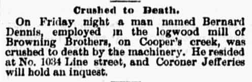 BERNARD DENNIS, or Barnard Dennis, as he his recorded in the 1878-1879 Camden City Directory, was appointed to the Camden Fire Department on June 19, 1872. He served as an extra man with Engine Company 2. He was dismissed from duty on July 15, 1873. He was replaced by Charles Elfreth. Bernard Dennis was born in Ireland in around 1842. He worked as a laborer. He was living at 222 Mickle Street when appointed to the Fire Department in June of 1872, and was still at that address when he was let go. The 1878-1879 City Directory shows that he was then living at 1 Fogarty Avenue. The 1880 Census shows him living with his wife Sarah and their three children, Edward, Margaret, and Thomas in Camden's Seventh Ward, where exactly, is not known as the address is not legible on the microfilm. A daughter, Jane, was born in October of 1880.