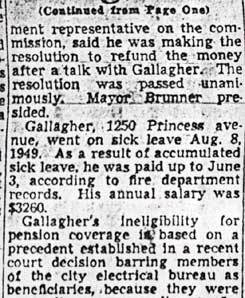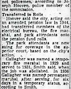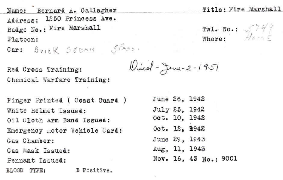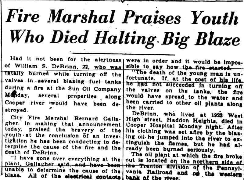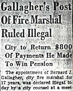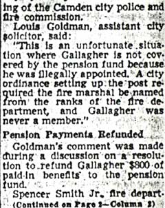 BERNARD GALLAGHER was born in July of 1872. He was living with his wife Celia at 278 Mt. Vernon Street and working as a bill collector from the 1890s through at least 1906. He moved to Gloucester City where he had a cigar store in the late 1900s, and did not return to Camden until after 1914. Bernard Gallagher worked as a detective, most likely at the New York Shipbuilding Corporation Shipyard, but possibly with the Camden Police Department in the late 1910s and 1920s before obtaining a position as the City Fire Marshal in Camden NJ in 1928. He was named temporary fire marshal as early as 1928, and served in that capacity until 1931, when the job was abolished. He was rehired in 1936, and stayed with the city until August 8, 1949, when he went out on sick leave. He was succeded as Fire MArshall by Maurice O'Brien. Bernard Gallagher was left without his city pension when it was discovered that his appointment was in violation of a city ordinance requiring the fire marshal be named from the ranks of the city fire department, of which he never was a member. Bernard Gallagher was living at 1250 Princess Avenue, in Camden's Parkside neighborhood with wife Celia and daughter Hazel when the 1918-1919 City Directory was compiled. His wife had passed prior to the April 1930 Census. Bernard Gallagher is shown in the 1947 City Directory as living with his second wife, Therese, at the Princess Avenue address, and his daughter Hazel resided there as well. Bernard Gallagher passed away on June 2, 1951. |