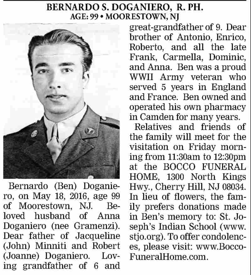 Liberty Street Cecile Graves - South 2nd Street Joseph Ward - Federal Street John M. Bowers - North 22nd Street Arthur F. Ballinghoff - Cramer Street George F. Borland - Howell Street Vito Zannoni - Point Street Leonard Buffetta - Point Street William F. Fournier - Bailey Street Joseph W. Migala - Mechanic Street Luca D'Oria - Haddon Avenue James E. Wright - Washington Street William DiBello - Henry Street John S. Zawila - South 9th Street Edward J. Haab - South 6th Street Theodore N. Guthrie - Fern Street Bernardo S. Doganiero - Division Street Jesse Massi - South 5th Street Joseph H. O'Hara - Lois Avenue John Mohllen - York Street Harvey Goodwin - Federal Street Robert Stockdale - North 9th Street Charles A. Williams - State Street Herman Foster - South 2nd Street