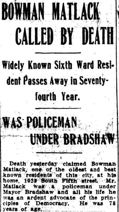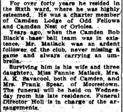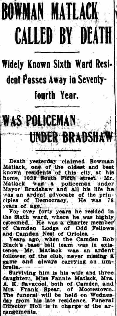 BOWMAN MATLACK was a well known personage in South Camden. He appears in the 1880 Census, living with wife Priscilla and three daughters at 635 South 5th Street. The Matlacks had six children, only three were living by 1910. In 1880 Bowman Matlack was working as a fish dealer. He served as a policeman under Mayor Claudius Bradshaw and Chief of Police Josiah Matlack. Bowman Matlack later worked various jobs as a laborer. Late in life he found work at an oilcloth plant in Camden. The Matlack family was living at 1730 South 6th Street in Camden in 1890. By 1900 they had moved to 1039 South 5th Street, where they would remain. Bowman Matlack to his end resided at 1039 South 5th Street. He died in May of 1914 at the age of 74. |