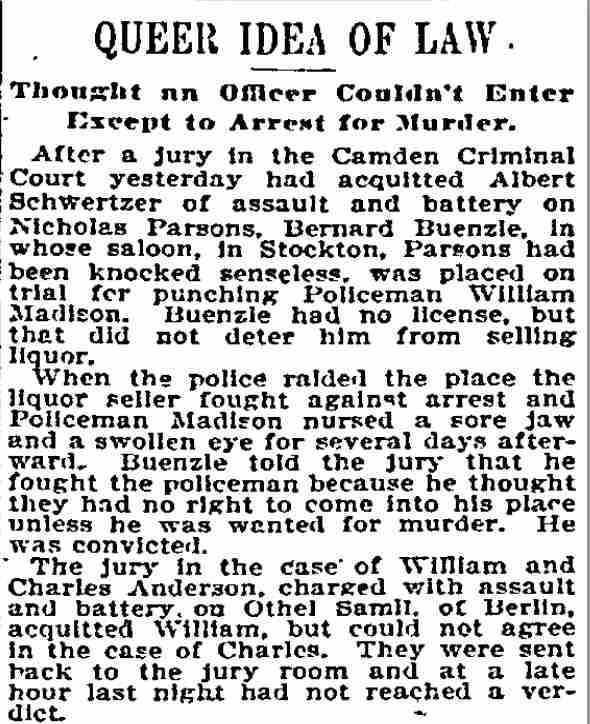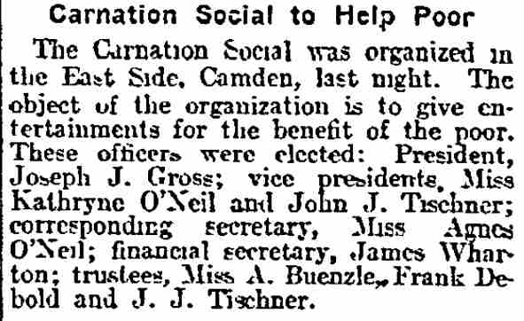 BURHARDT LEODEGAR BUENZLE and his wife, the former Catherine "Kate" Albisser, lived in Cramer Hill at 1144 North 24th Street from the 1880s until their deaths in the early 1930s. Burkhardt Leodegar Buenzle was born on October 22, 1857 in Zurich, Switzerland. His wife was born in November of 1857. The were married in Switzerland in 1878 and came to America shortly afterwards, settling first in Philadelphia, where son Joseph Anthony was born on August 26, 1880. The family was still in Philadelphia as late as 1883. By September of 1886 the Buenzles had moved to Camden. The Buenzles were Catholics and soon affiliated with St. Joseph's Church on Howell Street in what is now East Camden. Catherine gave birth to 12 children, sadly only one, Joseph Anthony Buenzle, survived them. A son William Joseph, born in Camden in September of 1886, died in 1913 at the age of 21. A daughter Amelia died in 1906 after childbirth. Amelia's son, William Seidelmann, was raised by Burkhardt and Catherine. All of the other child died at birth or shortly afterward. Catherine Buenzle died on February 17, 1930 in Camden. Her husband Burkhardt joined her on September 15, 1931. |