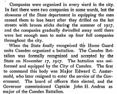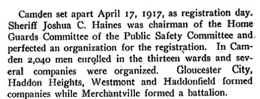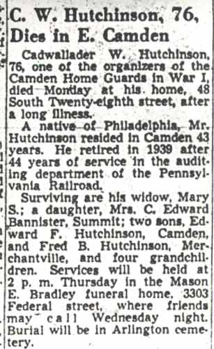 CADWALLADER W. HUTCHINSON was born in Philadelphia around 1874. In 1895 he began working in the auditing department of the Pennsylvania Railroad. He moved to Camden NJ around 1907. During World War I, Cadwallader W. Hutchinson was one of the organizers of the Camden Home Guards, a paramilitary organization that engaged in civil defense work when called upon. Cadwallader W. Hutchinson retired from the Pennsylvania Railroad on 1939 after 44 years of service. A resident of 48 South 28th street in East Camden, he passed away at his home on May 29, 1950. He is buried at Arlington cemetery in Pennsauken NJ. |