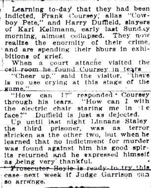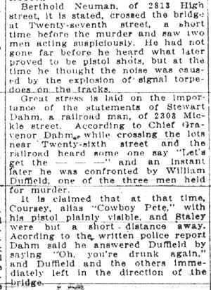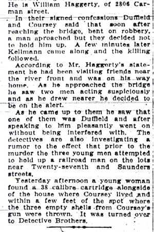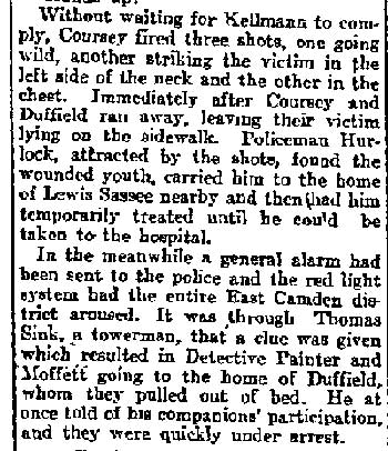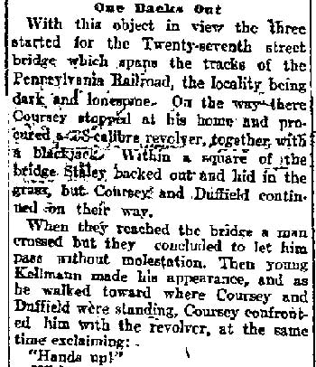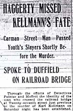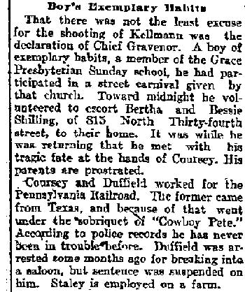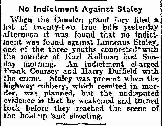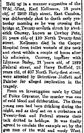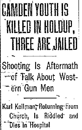 During the summer of 2006, Carl Kellman's nephew, Bob Kellman, told me about this case, where his Uncle, Carl Kellman, of 2919 High Street was shot down during a robbery at the railroad tracks at North 27th Street and Sherman Avenue in October of 1912. Harry Duffield, Fred "Cowboy Pete" Coursey, and Linaws Staley were arrested. Staley was cleared of any involvement in the crime in short order. Duffield and Coursey were convicted and sent to prison. A web-page about the event containing local newspaper articles was set up on September 28, 2006. Since that time, Bob and I have kept in touch, and on a visit, the two of us and a cousin of his retraced the route Carl walked on his last night. Recently Bob sent some photos from an album that Carl had, and I thought it would be appropriate to put a page together about the life of Carl Kellman, his family and friends. The original page concerning the murder of Carl F. Kellman is at /camden-stories/camdenheadline-101412-cpt.htm on this link for more about Carl Kellman and his life and times. August 8, 2009 |