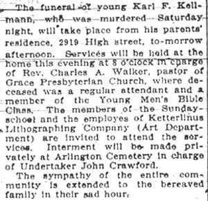 CARL F. KELLMAN was born in 1894 to Louise D. "Lulu" and Carl L. Kellman. He was the oldest of four children, coming before Helen, Frederick, and Alma. His father was born in 1868 in Germany; he came to America in 1891. His mother was born in Pennsylvania in 1870. They met and married soon after he arrived in America. The Kellmans moved to Camden in late 1899 or early 1900. They are not listed in the 1899 Camden City Directory, however, when the census was taken on June 7, 1900 the family was living at 2919 High Street in East Camden. Carl L. Kellman worked making surgical instruments, his younger son Fred would also work as a toolmaker as an adult. Carl Kellman attended Camden public schools, the nearest of course being the James A. Garfield School, just around the corner from his house at North 29th Street and Cramer Street. The family attended Grace Presbyterian Church, located on North 27th Street and Garfield Avenue, just across the railroad tracks in Cramer Hill. Carl Kellman attended Sunday School and later the Young Men's Bible class there. It was most likely through church where he met and became friends with the Skillen sisters, Bessie and Bertha. Bessie Skillen taught Sunday School at Grace Presbyterian in the early 1910s. The girl's mother and Lulu Kellman remained friends for decades. Artistically talented, as evidenced by the drawing below, Carl Kellman found work in the Art Department of the Ketterlinus Lithographing Company in Philadelphia. The company published posters and art prints. Examples of Ketterlinus' prints and posters can be seen at The Philadephia Print Shop, Ltd. website. Carl Kellman was shot and mortally wounded a few blocks from his home when robbed while coming home from a church carnival on October 13, 1912. He died the following morning. Three men were arrested, two were tried and convicted of the murder and sent to prison. The Kellman family remained on High Street for quite some time thereafter, Mrs. Lulu Kellman staying until the early 1940s, har husband, Carl L. Kellman, having died in 1936. Sister Helen married Captain Howard Meyer, who had served with distinction as an aviator with the United States Army in France during World War I. Younger brother Frederick married and lived for many years in Pennsauken, not far from the home where he had grown up. |