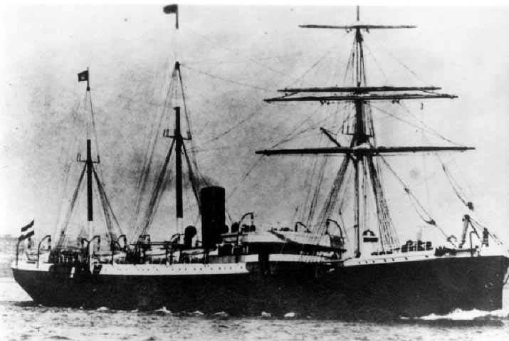The steamship RHAETIA was built for the Hamburg-America Line by Reiherstiegwerft, Hamburg (yard #341), and was launched on 23 November 1882. 3,553 tons; 107,11 x 13,07 x 8,86 meters (length x breadth x depth of hold); straight stem, 1 funnel, 3 masts; steel construction, screw propulsion, service speed 12 knots; accommodation for 96 passengers in 1st class and 1,100 in steerage; crew of 90. 4 April 1883, maiden voyage, Hamburg - Havre - New York. 4 November 1894, last voyage, Hamburg - Havre - New York. 1895, taken by Harland & Wolff in part payment for the PENNSYLVANIA ; sold to J. H. Bögel, Hamburg. 24 May 1898, sold to the U.S. Navy and renamed CASSIUS . 1900, SUMNER (U.S. Army transport). 11 December 1916, wrecked on Barnegat Shoals, New Jersey. |
