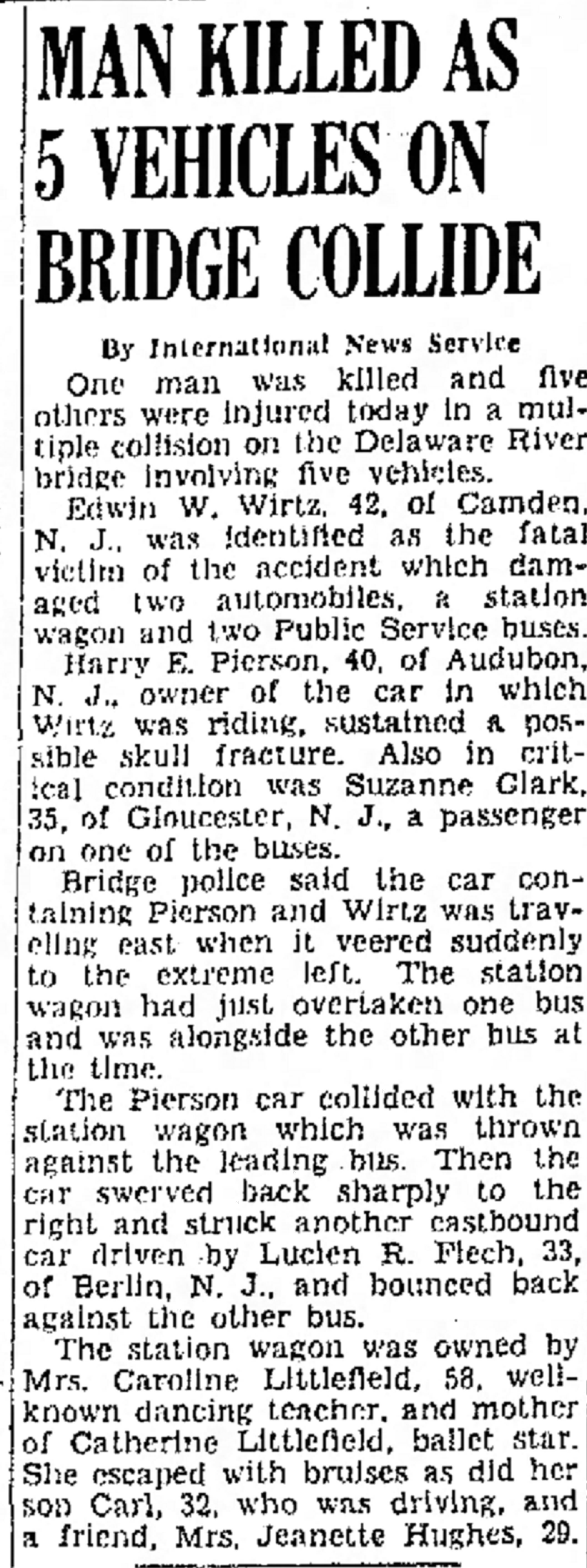 family was still at that address in the spring of 1942. Tragedy struck the Wirtz family in 1948 when father Edwin W. Wirtz was killed in a head-on collision on the Delaware River Bridge on January 16th of that year. Carl M. Wirtz was appointed to the Camden Fire Department on January 16, 1951, initially as a hoseman with Engine Company 2, and later with Rescue Company 1. He lived at 1421 Norris Street in the early 1950s. Carl