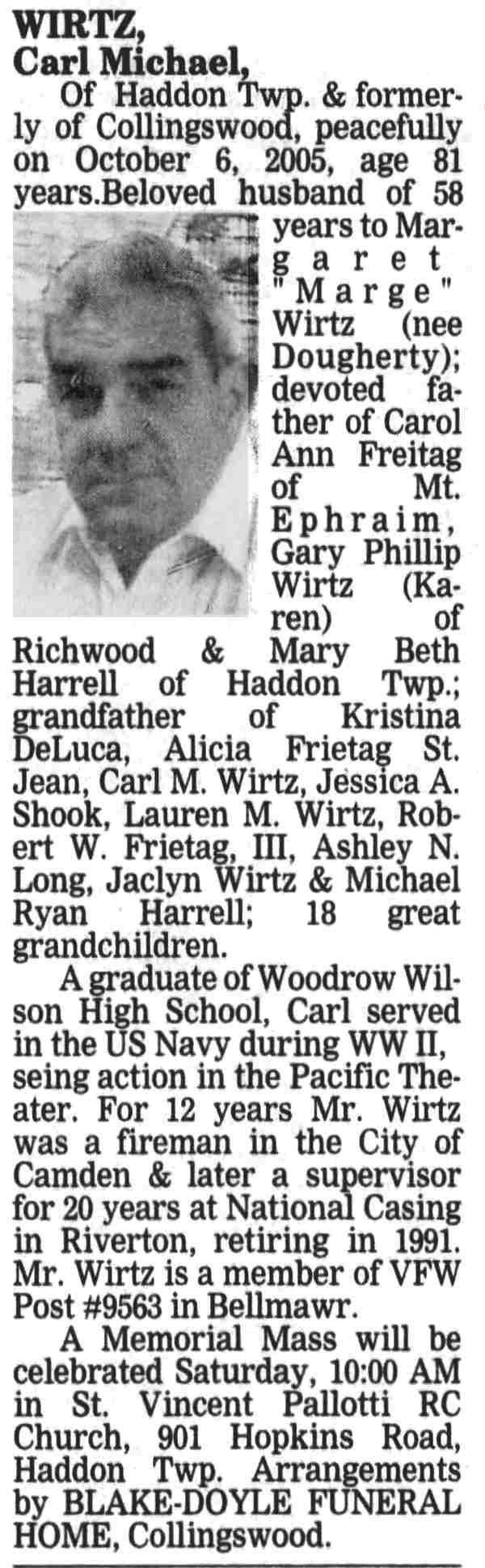 CARL MICHAEL WIRTZ was born in Camden, New Jersey on March 6, 1924 to Edwin Wirtz and his wife, the former Gertrude Magrath. His father worked in one of Camden's leather factories, as had his grandfather, Philip Wirtz, Carl Wirtz's uncle, Stanley Wirtz, worked for many years as a detective with the Camden Police Department. The