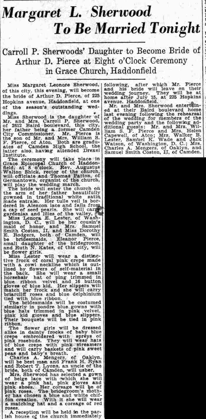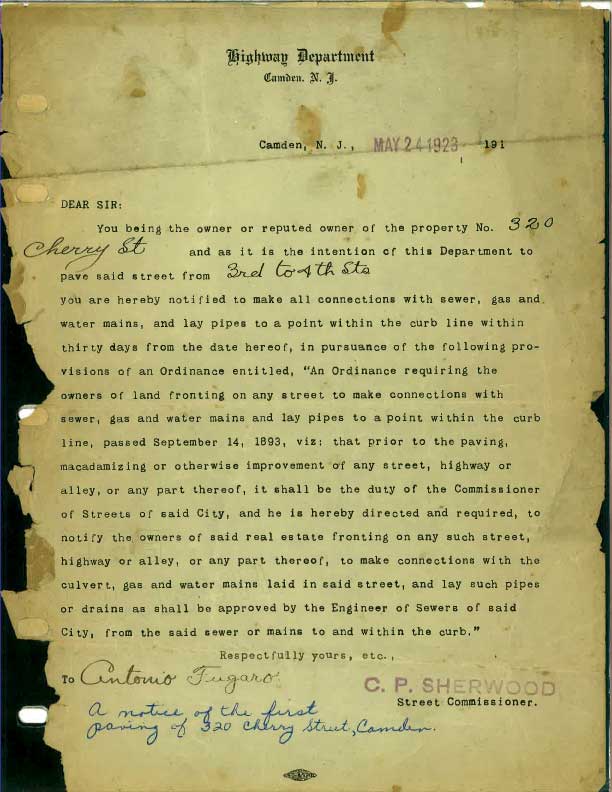 CARROLL P. SHERWOOD was born in Maryland around 1884. A mechanical engineer by trade, he lived at 611 York Street in Camden at the time of the 1920 census with wife Margaret Kates Sherwood and daughter, also named Margeret. Carroll P. Sherwood was elected to Camden's Board of Commissioners as a Democrat in May of 1923, and served for four years as Director of Streets and Public Improvement, during the administration of Mayor Victor King. He served one term, stepping down in May of 1927. Although endorsed, along with fellow commissioner Melbourne F. Middleton Jr., for re-election by Camden's Non-Partisan League, his slate, which included Dr. Orris Saunders, newly appointed Judge Frank F. Neutze, and realtor Carl R. Evered, did not win, and Carroll Sherwood left city government when the Republicans swept the May 1927 election. The following spring he was accused of some unseemly behavior in Salem County, but was cleared of these charges. Carroll Sherwood returned to city government, and served for many years on the City Board of Assessors. In 1947 He lived with his wife Margaret in 1947 at 614 erie street in North Camden. |