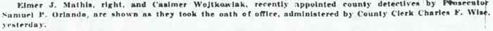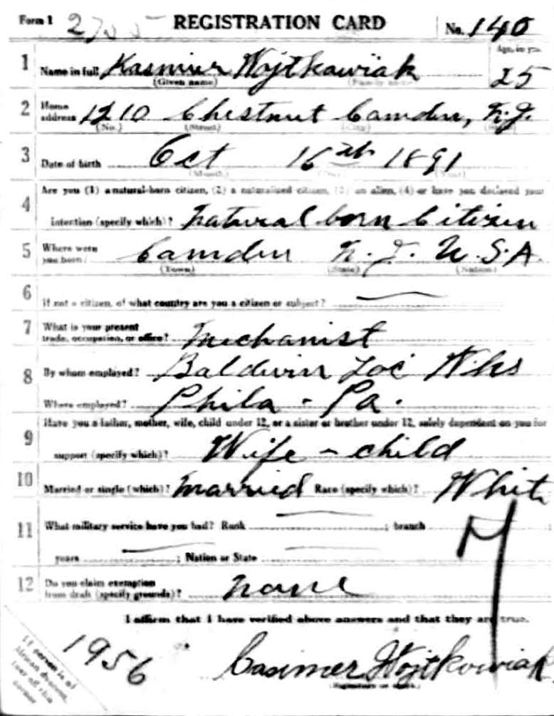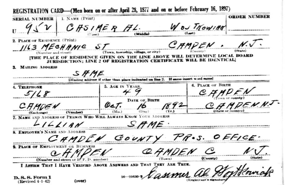 CASMIER WOJTKOWIAK was born in Camden NJ on October 16, 1892. He was one of eight children, seven of whom were born in Camden. His parents, John L. Wojtkowiak and Hedwig (Jadwiga) Sobus-Wojtkowiak and their eldest child Victoria came to the U.S. in 1884 into the Port of New York on the ship AMERICA. from Poland. Also aboard were two of John L.'s brothers, Andrew and Adalbert and his wife Marianna and their son Ladislaus. John L. Wojtkowiak was one of the founding members of the predominantly Polish St. Joseph’s Roman Catholic Church, located at South 10th and Mechanic Streets. The Wojtkowiak family was living at 1225 Chestnut Street as early as 1888, working as a laborer, according to the city directories of the day. The family was living at 1210 Chestnut Street at the time of the 1900 Census, and later moved to of 1212 Chestnut Street in Camden NJ. Casmier married Lillian M. Draim in 1913. Casmier acquired the nickname "Rube" because he was a large fellow and the Polish word for large or big is "Gruby." In 1915 Casmier and Lillian resided at 908 Sycamore Street and Casmier worked for the Ferry Avenue Bottling Company. Sadly, his older brother Private John Wojtkowiak was killed in action while serving with the United States Army in France in November of 1918. In 1919 Casmier worked as a shipworker and resided at 1227 Chase Street. When the Census was taken in 1920, Casmier and Lillian Wojtkowiak were living at 1210 chestnut street , which the family still owned. He was working as a driver for an ice company. His brothers Stephen and Stanley were also in the coal and ice business at that time. Casmier Wojtkowiak and Lillian by then had two children, Joseph and Veronica. Stanley Wojtkowiak went out on his own in the mid 1930s and operated the Stanley Heat & Fuel Company in Camden for many years thereafter. The 1924 City Directory for Camden shows C.A. Wojtkoiwak working as a court interpreter, a position he held into the mid 1930s. At the time of the 1920 City Directory compilation and the taking of the 1930 census, Casmier Wojtkowiak was living with his brother Stanley and his family at 1212 chestnut street . Stanley Wojtkowiak, then a bus driver, would go on to found the Stanley Fuel Company, which served Camden for many years. The neighbors at 1210 chestnut street in those times were the Murawski family. Their son, Joseph Murawski, was later killed while serving with the United States Army during World War II. Casmier Wojtkowiak was then working as a government interpreter. In February of 1934, he was appointed as a detective by then County Prosecutor Samuel P. Orlando. Casmier Wojtkowiak served under the direction of Chief of Detectives Larry Doran. Casmier Wojtkowiak later made his home at 1155 Louis Street, around the corner from where he had grown up. When he registered for the draft in the spring of 1942, he was still with the Prosecutor's office and was making his home at 1163 Mechanic Street. Eventually Casmier and Lillian Wojtkowiak moved to Wenonah, NJ. He passed away in 1945, and was buried at St. Joseph's Cemetery on Chews Landing Road in Gloucester Township NJ. He was survived by his wife Lillian, and two children, Joseph Wojtkowiak (who became a stationary fireman at the Camden Court House) and Veronica Wojtkowiak-Cisek (or Ciszek). Casmier's first cousin, by his uncle Adelbert, was Mitchell Wojtkowiak, who served for over 33 years with the Camden Fire Department. His nephew, John White, son of his brother Stanley, was a fighter pilot during World War II. |