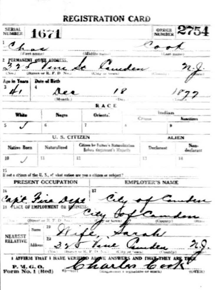 The funeral of Charles Cook. Sr. who died Saturday, will be held at 2 p. m., Wednesday, at his late home, 325 Vine Street. Mr. Cook was a member of Camden Lodge No. 15, F. and A. M., and Rescue Council No. 15, Fraternal Patriotic Americans. He is survived by his wife, Sarah. Burial will be private in Harleigh Cemetery. |