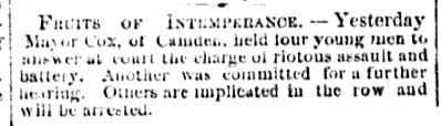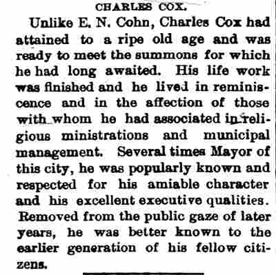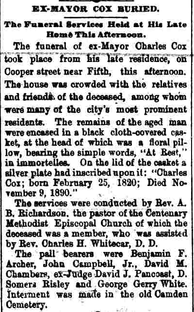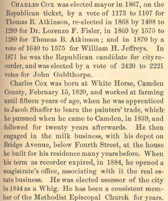 In 1867 he was elected mayor of Camden, and was re-elected three times consecutively. He served as city recorder until 1884, when he was made justice of the peace, and operated a real estate office. By 1878 he was living at 505 Cooper Street in Camden. He resided at that address until his passing, at the age of 71, on November 9, 1890. Charles Cox was an active member of Union Methodist Episcopal Church. Later in life he belonged to Centenary Methodist Episcopal Church.