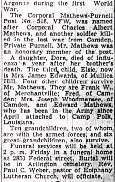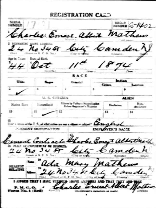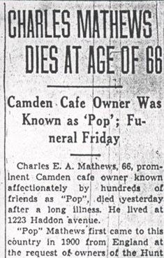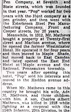CHARLES ERNEST ALBERT "POP" MATHEWS was born in England on October 11, 1874. He came to America with his wife Ada and three children in 1900, having been recruited by the Hunt Pen Company in Camden. He worked there for two years, then took a position with the Esterbrook Pen Company in 1902, remaining there for twenty years. While at Esterbrook, he went into the hotel and bar business. In 1912 he purchased a property at 21st Street and Marlton Avenue and opened the Westminster Hotel. He operated it for four years, then moved to Maple Shade NJ. By 1918 he had returned to East Camden, living at 24 North 34th Street. Charles E.A. Mathews at that time had gone into business as a cement contractor. He is listed in the 1931 Camden City Directory as running a cafe at 931 Market Street. After the repeal of Prohibition, "Pop" Mathews opened the East End Hotel at Maple Avenue and the railroad in Pennsauken NJ. After two years he sold the business. He later acquired the bar at 1223 Haddon Avenue, where he would reside in his remaining years. During World War I, "Pop" Mathews' son c harles Albert Mathews enlisted in the 3rd Regiment, New Jersey National Guard, and went with the regiment on July 25, 1917 to Camp Edge, Sea Girt NJ. He was sent on with the 3rd New Jersey to Camp McClellan, Anniston AL, where the 3rd became the 114th Infantry Regiment. Assigned to Company G, he was the gas instructor for his company. Corporal c harles Albert Mathews died of wounds in France on October 14, 1918, during the Battle of the Argonne Forest. He was 24 years old at the time of his death. Another Mathews child, Dora Mathews, died of influenza the following year. Charles E.A. "Pop" Mathews passed away on July 6, 1942 after a long illness. The bar where he lived, at 1223 Haddon Avenue in Camden NJ, was known then and now as Donkey's Place. Charles E.A. Mathews was buried near his son at Arlington Cemetery in Pennsauken NJ. |