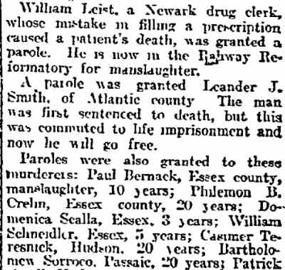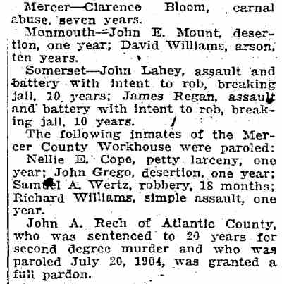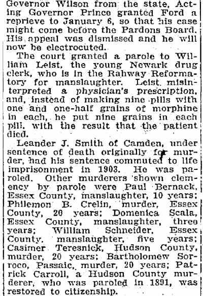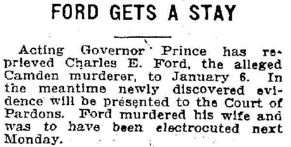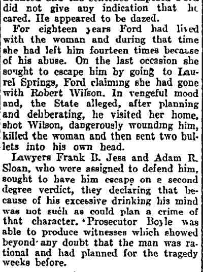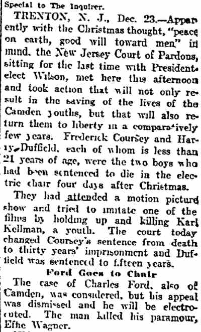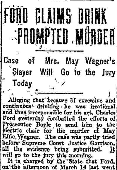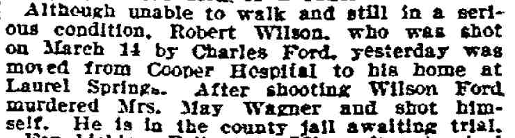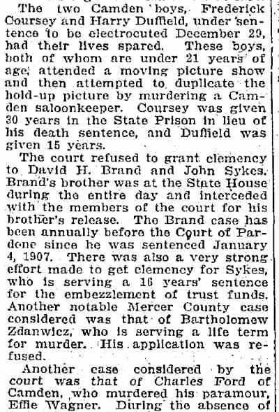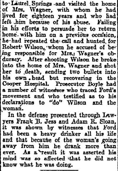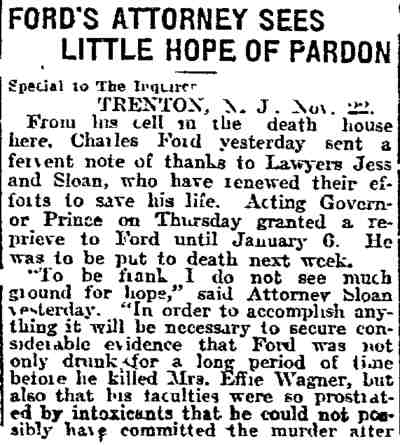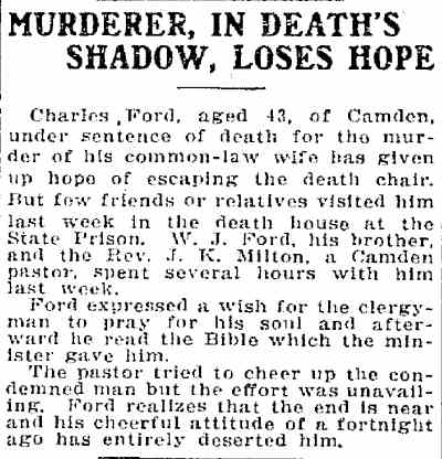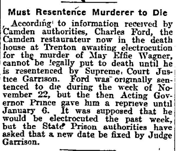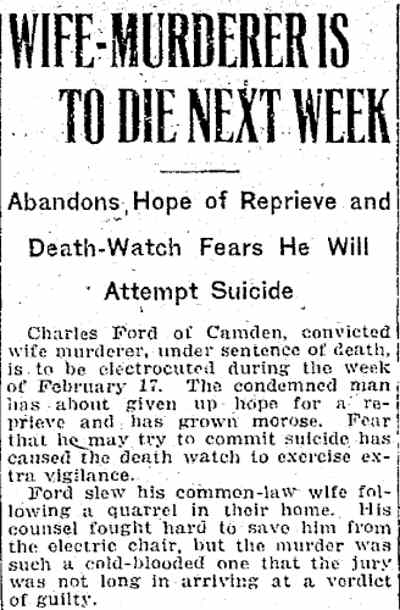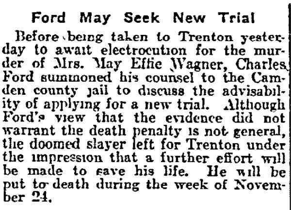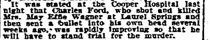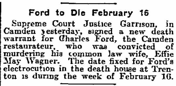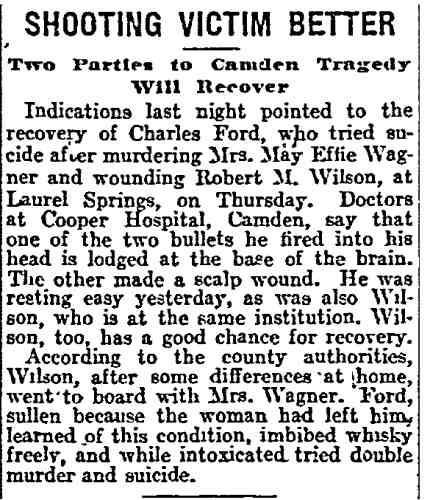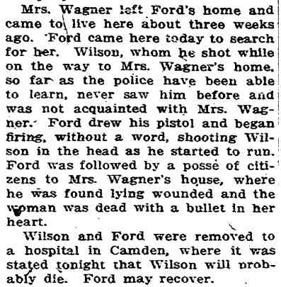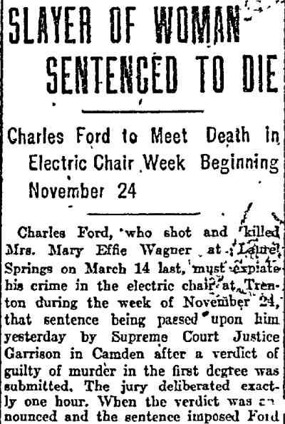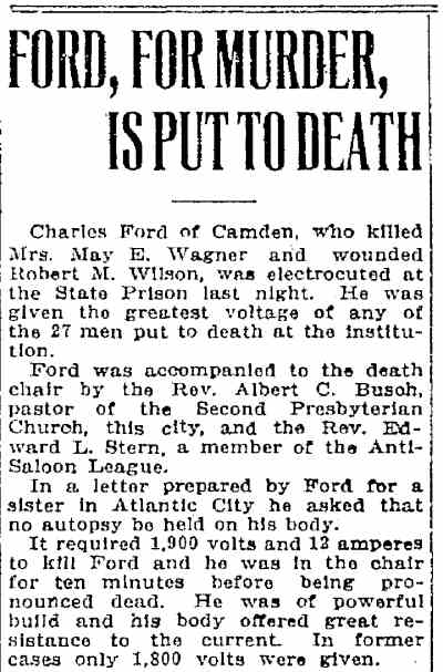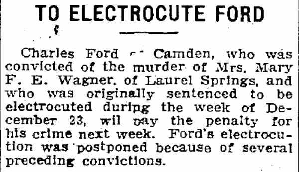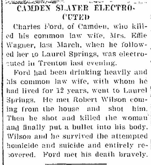 CHARLES FORD was born in New Jersey around 1870. Charles Ford appears to have been living in South Philadelphia and working as a huckster when the Census was taken in 1900. Effie May "May" Wagner was living in South Philadelphia with her son Casper and then husband Frederick. This relationship seeps to have ended not long after the 1900 census. The 1901 City Directory shows him at 125 Chestnut Street. By 1902 Charles Ford and May Wagner were living together in Camden, at 1010 Carpenter Street. the 1903 Directory shows them at 203 Chestnut Street. The 1904 version gives his address at 304 Mechanic Street, 1905 at 121 Chestnut Street, and 1907 has him at 1074 South 2nd Street. Charles Ford continued to work as a huckster during these years. The 1908 and subsequent city directories show Charles Ford operating a restaurant at 123 Kaighn Avenue. The 1910 Census indicates that this was an oyster saloon. The Census and the above-cited City Directories indicate that Charles Ford and Effie May Wagner were living as husband and wife. The 1910 Census shows her sons Casper and another son, Harry, had the name of Ford as their surname. Charles Ford drank heavily. He may have been a wife-beater, all we have in that point is hearsay. What is known is that Effie May Wagner ended their relationship and went to Laurel Springs, New Jersey to be with another man, Robert Wilson. Charles Ford's reaction, on March 14, 2012, was to go to Laurel Springs, shoot Wilson, shoot Effie May Wagner, and shoot himself. He managed to kill Effie May, wound Wilson and wound himself. Wilson and Ford recovered from their injuries. Charles Ford was tried for Effie May Wagner's murder, found guilty, and executed on February 18, 1913. |