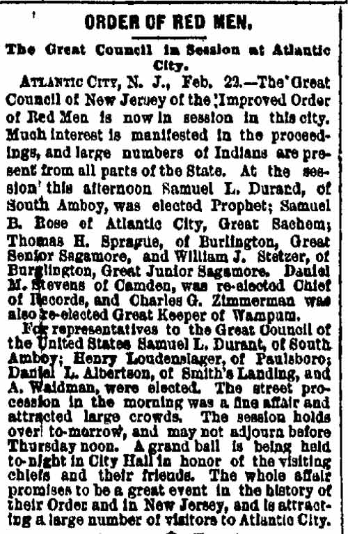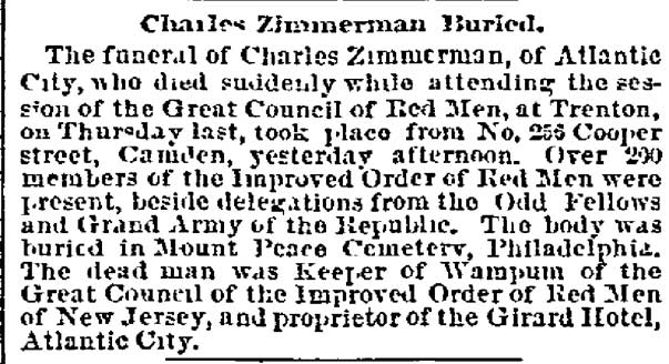 Annual salaries for the members of the paid force were: Chief Marshal, $800; Assistant Marshal, $200; Engineer, $600; Driver, $450; Stoker, $450; Tillerman, $450; Extra Men, $50. All but Extra Men were paid monthly. Charles G. Zimmerman was a member of the Thomas M.K. Lee Post No. 5, Grand Army of the Republic (G.A.R.). Charles G. Zimmerman was also a member of the Wyoming Tribe No. 55 of the Improved Order of Red Men, as were fellow Camden Fire Department members James M. Lane and Joseph H. Minnett. George Reeser Prowell, in his History of Camden County, New Jersey, published in 1886, wrote the following about this organization: WYOMING TRIBE, No. 55, was instituted July 8, 1880. The Great Chiefs present were Great Prophet, Wm. P. Hall; Great Sachem, James M. Smith; G.C. of R., John T. Davis. The first Chiefs of the tribe were Prophet, Joseph H. Minnett; Sachem, Alonzo Bicking; Senior Sagamore, Chas. G. Zimmerman; Junior Sagamore, Wm. F. Propert; C. of R., D.C. Vannote; K. of W., Jos. B. Fox. The present Chiefs - P., J.A. Dold; S., Henry C. Boddy; S.S., Wm. B. Bignell; J.S., Wm. J. Boddy; C. of R., D.C. Vannote; K. of W., J.B. Fox. The number of members is one hundred and fifty-eight. The lodge meets Wednesday evenings at Third and Market Streets. Charles G. Zimmerman left the Fire Department on January 8, 1872. He stopped appearing in Camden's City Directories in 1885. He moved to Atlantic City and opened a hotel known as the Girard House at 2001 Atlantic Avenue. He passed away in Trenton, New Jersey while attending the state convention of the Improved order of Red Men on February 28, 1889. His widow, Mrs. Keturah Zimmerman, stayed in Atlantic City and ran the hotel for a short time. She was still living in Atlantic City as late as 1901. Mrs. Zimmerman passed away in 1917. Charles G. Zimmerman's nephew, Arthur A. Zimmerman, the son of his brother Theodore, was the premier bicycle racing champion of the 1890s and early 1900s. |