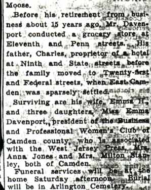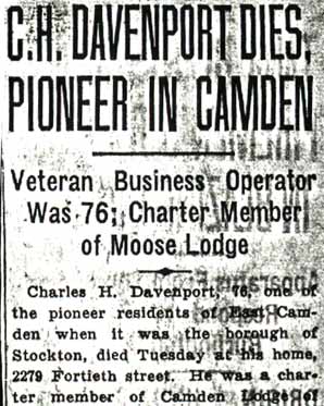 CHARLES H. DAVENPORT was born in 1858 in Connecticut to Charles and Harriet Davenport, the second child, coming after sister Sarah. The family moved to Camden shortly thereafter. His father fought in the Civil War with a New Jersey infantry regiment. After the war the elder Davenport ran a grocery, and then a hotel at North 9th and State Streets. At the time of the 1880 Census he owned a hotel at 9th and Market Streets. The Davenports later moved to 21st and Federal Streets, and were one of the first families to move to the area, then in Stockton Township, when development began. By 1887 Charles H. Davenport had moved to North 11th and Penn Streets, where he conducted a grocery store until he retired around 1920. He was then living at 201 40th Street in Camden. After his retirement he worked occasionally as a house painter. Charles H. Davenport was a charter member of Camden Lodge 111, Loyal Order of Moose. He purchased a house at 2279 North 40th Street in Pennsauken NJ during the 1920s. He passed away on October 13, 1936 and was buried at Arlington Cemetery in Pennsauken.. He was survived by his wife, Emma, and three daughters. |