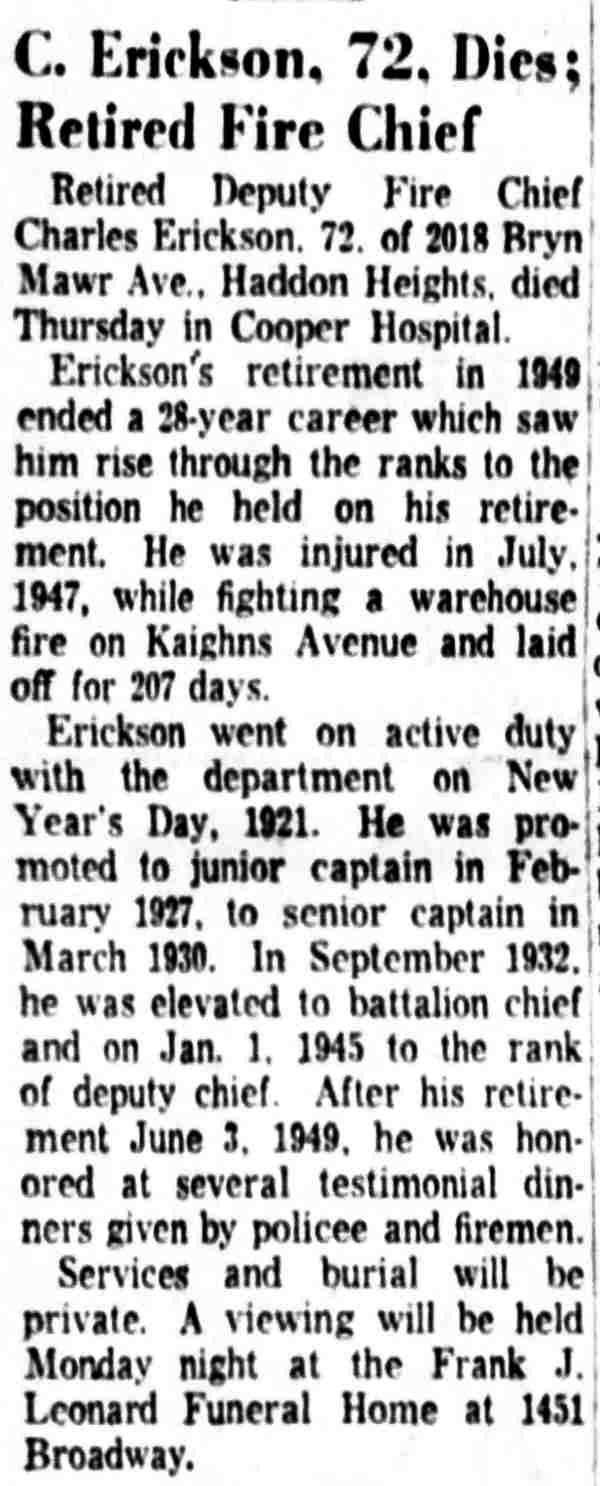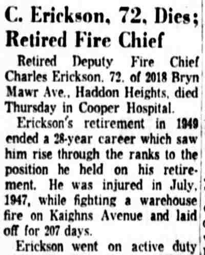 Kresge Camden Foundry Broadway North Front Street Elm Street Charles H. Errickson Walter A. Mertz William Reed Thomas McParland Howell Needham Theodore N. Guthrie Engine Company 8 Edward Sheehan David Visor John N. Tobin Mair H. Auerbach Dr. A.J. Kilberg Dr. Folkman |