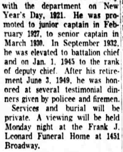 The savings of a widow were saved last night by Battalion Chief Charles Errickson as flames destroy ed a photographic studio in her home at 939 Newton Avenue. Erickson worked his way through dense smoke at the home of Mrs. Carrie C. Perkinpine to get her savings in a small box in a second story bedroom. Mrs. Perkinpine lived with her son, Leonard J. Farrar, who has been unemployed two years. He was to have started work as a photographer next Monday but all of his equipment, including a camera, were lost in the fire. “I had banked the furnace in the cellar for the night and was reading in the dining room when I heard a crackling noise," Mrs. Perkinpine said. "I opened the cellar door and was nearly overcome by a gust of smoke.” She ran to the home of neighbors across the street and they called the fire department. Four companies responded under Errickson. The fire spread to the photographic studio set up in the cellar by Farrar and destroyed his developing and enlarging equipment as well as the camera. Firemen were unable to account for the origin of the blaze unless sparks from the furnace ignited a pile of rubbish in the cellar. The tire was confined to the cellar although the upper rooms were damaged by smoke. Three other families were forced to flee their homes because of smoke from the Perkinpine home. |