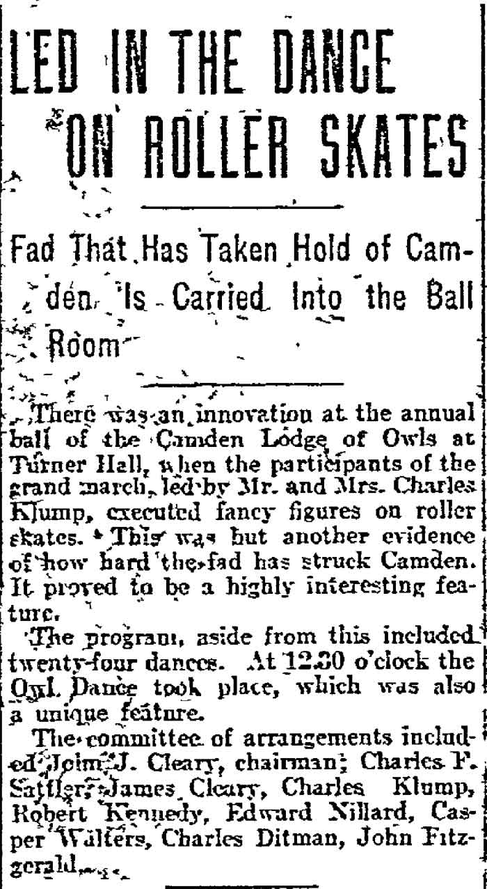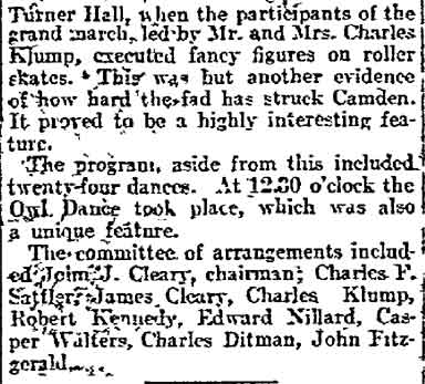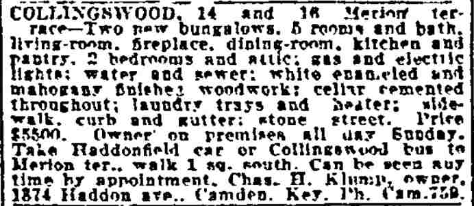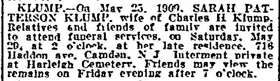 CHARLES H. KLUMP was born in New Jersey in 1881, and originally worked as a lithographer and printer by trade. He was married to Sarah Patterson in the 1900s, sadly, she passed away in 1909. He remarried not long afterwards. Directories from 1911 through 1913 show him at 1101 Broadway. He would have then been in rented lodgings as this was Adam Davis saloon and hotel then known as The Palace. On cane deduce that it was here that Charles Klump learned much about owning and operating a bar. By 1914 Charles Klump and second wife Marion had settled in at 1374 Haddon Avenue, which would be his residence for the rest of his days. Charles Klump got into the bar business shortly before the 1916 City Directory was compiled, at 11 South 3rd Street. When Prohibition was enacted in 1919, Charles Klump remained in business on South 3rd Street. He passed away in 1929. Marion Klump is listed as the owner of the bar in the City Directory for 1931. Besides the bar, he left Marion well taken care of, as by April of 1930 she owned an expensive for its time home at 347 Haddon Avenue in Collingswood, where she lived with her sister Alma Deegan. Mrs. Marion Klump still owned the bar as late as 1934, as she is named in a Camden Courier-Post article as a tavern owner. No further directories were published until 1940, however, it appears that new management was in place by 1936. By October of 1936 the place appears to have changed hands, and was operated by Joe O'Brien. Mrs. Klump still resided on Haddon Avenue at that time. Marion Klump later moved to 267 Cedarcroft Avenue in Audubon NJ, where she was living in the fall of 1959. Marion Klump never remarried. She died in 1963 and was buried in Harleigh Cemetery next to her husband. |