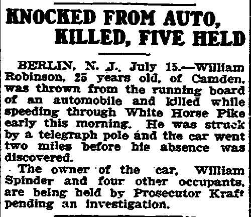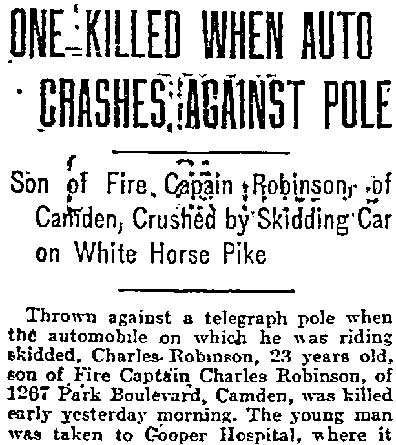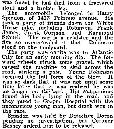 was an error in reporting this story. William Robinson was killed in the accident, not Charles Jr. William Robinson - Charles H. Robinson - Park Boulevard - Princess Avenue Harry Spandon - Frank James - Frank Gorman - Raymond Schuck Lawrence Doran - S.G. Bushey |