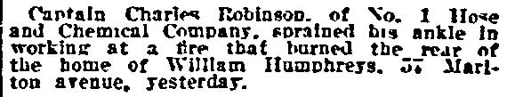 A STROKE DRIVING TEAM Strapped to Seat, Lewis Buzine was Helpless in Run of Many Squares MANY CLOSE CALLS FOR NO. 3 ENGINE Stricken with paralysis while strapped to his seat of his engine Lewis Buzine, driver of No. 3 Engine Company, held the reins for many squares before his plight was discovered. Not until the horses were stopped by the apparatus striking the side of the engine house were fellow members of the company aware of his illness . Answering a false alarm coming in from the new Colored High School at Eighth and Chestnut Streets, Stoker Samuel Lodge noticed that the engine was not being driven by Buzine with his usual care. On reaching Eighth and Chestnut Streets, and finding there was no fire Lodge ordered Buzine to drive near a horse trough for water to extinguish the embers under the engine. He was surprised when Buzine paid no heed to him. As the apparatus rolled in Chestnut Street Captain Charles Robinson, of No. 2 Chemical Engine Company on Kaighn Avenue got on behind with Lodge, As they neared Seventh street the rumble of an approaching electric train was heard. The horses were galloping and Lodge called to Buzine to drive more carefully. The gates dropped suddenly, the horses came to a quick halt and the train passed. Captain Robinson then pulled the bell and on the first clang the horses started with a jump, and unrestrained by the usually trained hand of the driver they sped along to Broadway when they turned suddenly, nearly crashing into the curb in front or Davis' saloon. The animals then started down Broadway at full speed, narrowly escaping hitting many wagons. Shaken up and suffering from bruises on the hips and sides caused by being thrown against the engine as it wobbled from side to side, Stoker Lodge jumped when the horses veered into the engine house, and hurried to Buzine, supported by straps about his waist. The driver was leaning forward with his right arm hanging by his side. Not responding to questions buzine, who is a brother of ex-Assistant Fire Chief Samuel Buzine was unstrapped and tenderly carried to his home at 1606 broadway and Dr. Kirk was summoned. He feared that a ruptured blood vessel caused the paralysis of the right side. His condition today is serious. |