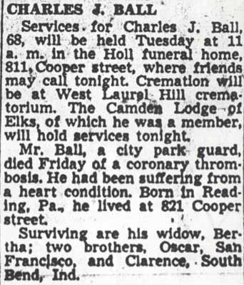 CHARLES J. BALL was born in Reading PA in 1881. By 1920 he had moved to Camden NJ, where he was working as a buyer for a restaurant. At the time of the census in January of 1920, Charles Ball was renting a room at 225 South 6th Street. He had married around 1904, but by this time had parted from his wife. He remarried around 1928. By the time the 1930 Federal Census was taken, Charles J. Ball and his wife Bertha were living at 1045 Cooper Street in Camden NJ. He was then the proprietor of a drugstore. Charles J. Ball appears in the 1947 Camden City Directory. At this time he and his wife are living at 821 Cooper Street, and he is working as a park guard for the city of Camden. Shortly thereafter Mr. and Mrs. Ball moved to 821 Cooper Street, a few doors down from the Camden Elks Lodge to which he belonged. Late in life he developed a heart condition, and he suffered a fatal coronary thrombosis on July 15, 1950. |