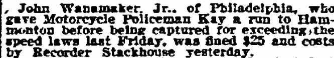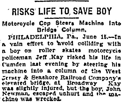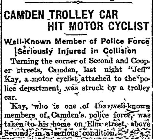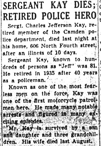 CHARLES JEFFERSON 'JEFF' KAY was born in Camden in October of 1860 to Isaac B. and Rebecca Kay. The 1880 census shows him living at 627 South 6th Street, the home of his parents, and working as an upholster. Also home was older brother Harry Kay, and two younger sisters, Mary and Violetta. Directories from 1883 through 1885 all show Charles J. Kay living with his family at 317 Arch Street, working as a driver. Charles J. Kay turns up in the 1887-1888 and 1888-1889 Camden City Directory. He was then a teamster, and living at 444 Pine Street. He shows up in the 1890-1891 directory as a driver, basically the same thing, living at 921 Lawrence Street. The 1893-1894 City Directory shows him living at 325 Cole Street. The 1894-1895 City Directory shows him at 323 Cole Street, working as a fireman. Charles J. Kay joined the Camden Police Department in 1895. He was still living at 323 Cole in the 1896 Directory. The 1897 Camden City Directory lists Charles J. Kay at 324 North 3rd Street. He was living at 306 Linden Street when the 1898 City Directory was compiled. The directory for 1899 shows him living at 217 Linden Street. By June 6, 1900 he was renting a home at 217 Linden Street with his wife of fourteen years, Elizabeth, and their two children, Violetta and Harry. By 1906 he had moved to 204 Elm Street in North Camden. When the census was enumerated in 1910 he, was living with his wife Elizabeth and 14-year old son Harry A. Kay, still at 204 Elm Street. Despite his age, he became on of Camden's first motorcycle policemen. The Kay family was still at 204 Elm Street in 1914. By 1920 he had been promoted to Sergeant, and was living at 606 North 4th Street. His son, who had married, was then working as a shipyard electrician. He was still on the force and living on North 4th Street in April of 1930. He was Sergeant and still on the motorcycle squad as late as October of 1931. Sergeant Kay retired from the police department in 1935 after having served the City of Camden for 40 years. He was 75 years old when he finally turned in his badge. Elizabeth Kay died in August if 1940. After an illness of ten days, Charles Jefferson Kay joined his wife on March 27, 1941 and was buried at Calvary Cemetery survived by his son and daughter and three grandchildren. |