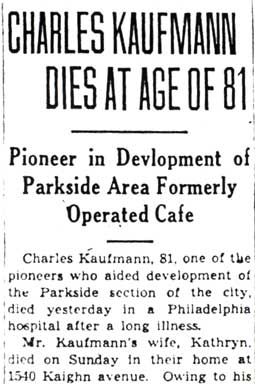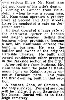 Charles Kaufmann was born around 1861. He came to Camden from Philadelphia while a young man. In the 1887-1888 Camden city directory, he is shown at 620 North 2nd Street, working in a spice mill. He soon went into business for himself, and the 1888-89, 1889-90, and 1890-91 directories show him as operating a grocery at North 2nd and and Arch Streets. He next operated a café on Jefferson Street in South Camden, near the Howland Croft & Sons Company textile mill. Charles Kauffman’s next enterprise was to operate a large café at 1299 Kaighn Avenue, the northwest corner of Haddon and Kaighn Avenues. He was living there at the time of the 1910 Census. This building was demolished in part in 2002. When Prohibition was enacted in 1919, he sold this business, and devoted his full attention to construction and development. In the early 1910s Charles L. Kaufmann opened up a movie theater, which he called the Forest Hill, at 1187 Haddon Avenue. Not long after th 1914 City Directery was compiled he built a new forest hill theater at 1189-1191 Haddon Avenue, which was renamed the Parkside Theater in late 1926 or early 1927. Charles Kaufman also developed, built and owned many other properties in the Parkside section of Camden. After retiring from business, Charles Kaufmann built a large home at 1540 Kaighn Avenue, opposite Farnham Park. It was the first home built in that section of Parkside. Charles Kaufmann passed away in a Philadelphia Hospital after a long illness, at the age of 81, on January 13, 1943, only a few days after his wife Kathryn died at their home. Owing to the seriousness of his own illness, he was unaware of his wife’s passing. Mr. and Mrs. Kaufmann were buried at Harleigh Cemetery in Camden NJ. Charles Kaufmann was survived by his brother, John Kaufmann, of Camden. |