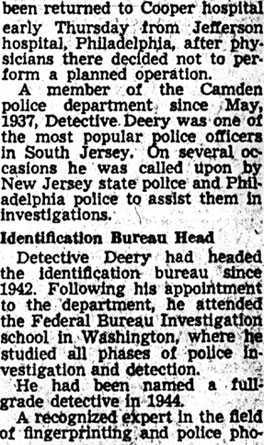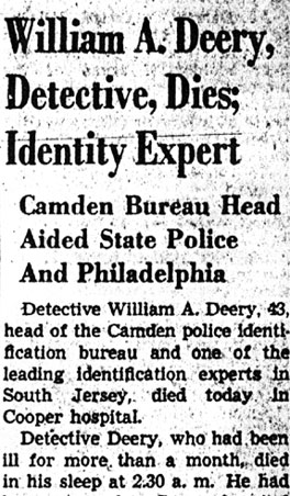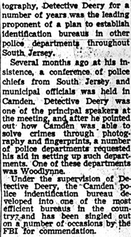 GETS WARD'S JOB AS KOBUS ORDERS COP SHAKEUP SHAW MADE ASSISTANT IN PLACE OF KOERNER In a shakeup of Camden police officials yesterday afternoon Lieutenant Samuel E. Johnson was named acting chief of detectives by Commissioner Mary W. Kobus, director of public safety. Lieutenant George A. Ward, who has been in charge of the detective bureau for a year, was transferred to take Johnson's place in charge of headquarters. Detective Louis Shaw was made assistant to Johnson, replacing Detective Sergeant Gus Koerner. Koerner was transferred to the Second District, for radio car and street duty. The new order became effective at 4:00 PM yesterday Police Chief Arthur Colsey announced the changes in the bureau after a two-hour conference with Commissioner Kobus yesterday afternoon. Maurice Di Nicuolo, who has been an acting detective, was transferred to the First Police District, with former Acting Detective Clifford Del Rossi returning to his old post in the detective bureau. In the only other transfer announced, Sergeant Harry Newton was switched from the First Police District to the Third, with Sergeant Edward Carroll going from the Third to the First. Although no other changes were made public, it is believed yesterday’s are a forerunner of numerous shifts to be made today or early next week.’ “These changes are being made for the good of the service,” Commissioner Kobus declared. “There will be other transfers of officers and men so that all the police may familiarize themselves with all the branches of the department.” Lieutenant Johnson was a appointed a policeman on January 1, 1910. After 10 years as a patrolman, he was promoted to a detective, where he made a splendid record. On November 28, 1928 he was made a sergeant, and again promoted on April 8, 1930, when he became a lieutenant. Ward was appointed a policeman on August 2, 1917, promoted to detective January 1, 1927, sergeant November 14, 1928 and lieutenant on January 24, 1930. Johnson was a detective sergeant when former Police Chief John W. Golden was head of that bureau, but later was transferred to police headquarters. Ward has been in and out of the detective bureau several times. He served for a time as the commander of the First District and later was ion charge of the police headquarters on the 12:00 midnight to 8:00 AM shift. He was a political lieutenant of former Public Safety Director David S. Rhone. |