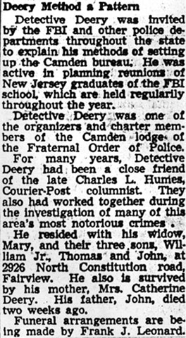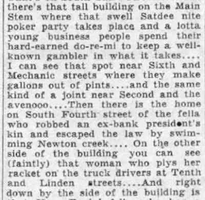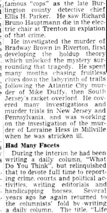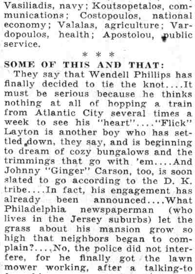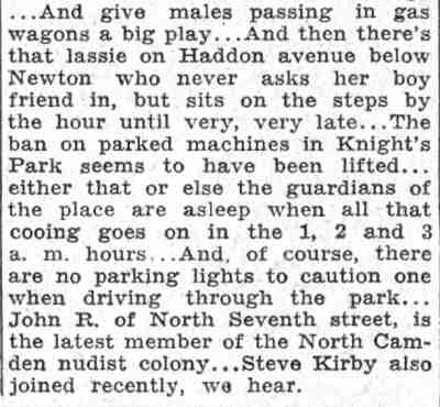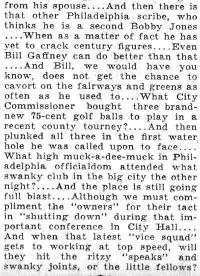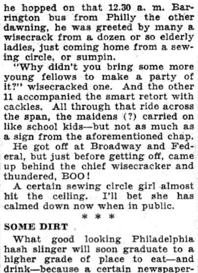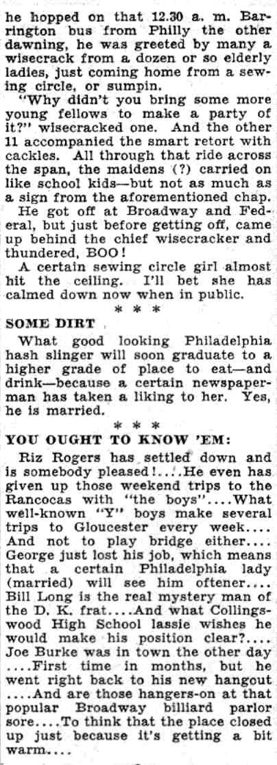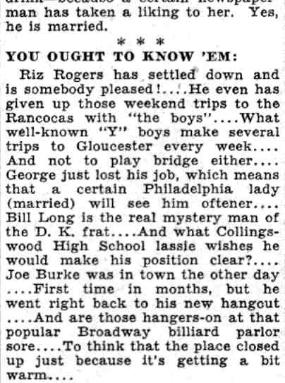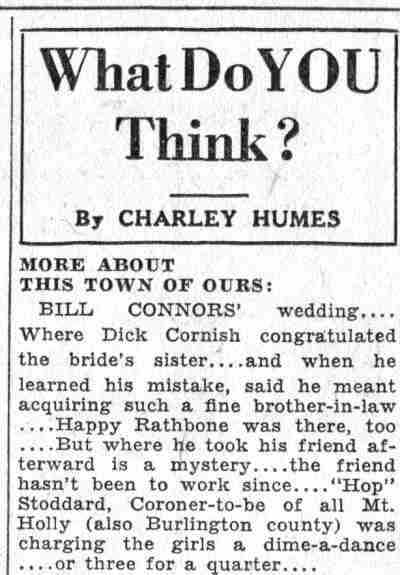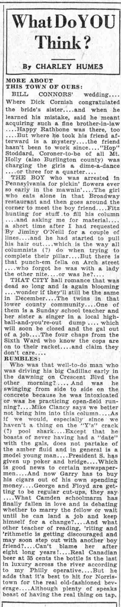 What Do YOU Think? By CHARLEY HUMES PUT THESE TOGETHER, YOU JIG-SAWERS: That big Roadhouse opening in Burlington County February 11… That swell social cellar in that Haddonfield home where all the biggies travel (They claim it's not a speak but they sell what it takes there, including some of that Brooklyn beer)… The two football stars that took it on the eye t'other night when they attempted to lay it on several lads from Burlington County… What Mt. Holly churchman bitterly opposed to Sunday movies attended a show the other Sabbath (Maybe he was investigatin', huh?)… That Honey-Hive in Philly (near Fortieth and streets), where a lotta Camden wives and ex-wives go… What Burlington County erster parlor lets its customers wash it down with beer?. . In what Camden County road easy does the chorus wear a fig leaf? ..Who were the three local Gals "picked up" by that New York car in Philly night before last or the before that?. .And why the three name three Camden newspaper people as friends? (it would have been okay if they'd left their names, too)…The Fairview Gal who took it on the chin last Satdee (Much to the later disgust of a well-known felIa)… What Mt. Holly man gets real peeved when tagged "Greenberg?" ….And who is the young man in the same town who purchased a marriage license and then failed to use it? (Going back to New York and leaving the Gal all bothered)… Who is the famous politician who parades the Philly streets with his big Jersey-licensed car until he makes a blonde or two?… In what Pennsauken house was an important political gathering held one or five nights ago when it was decided to ditch a prominent person running for the School Board?.. Why was that fella recently arrested for having a slot machine fined $100 for his first offense and the rest of the places in Pennsauken using the machines not bothered? … Who are the two prominent politicians (one from each party) who have formed an alliance that they make trouble for certain individuals in the coming election? ..What political county chairman will have opposition in every town in the county next spring?.. The works are in for what Big Shot in the political field whose resignation will startle old-timers and make a place for a younger fella (And I don't mean that City Commissioner who is going to resign despite pressure and denials)… What political fella made the rounds the other day and collected about $1500 and then.. .And what big politician got all hot and bothered because his office furniture was assessed for $5OO?.. ". |