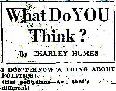 What Do YOU Think? By CHARLEY HUMES Assemblyman Millard E. Allen has been reading a book, I betcha. And in the book, the big, dastardly villain, his legs shackled in irons that clanked as he walked, is being led to the slaughter. And right then, Mister Assemblyman Allen gets an idea. At least he is of the opinion that it is an idea, but I don't go for it very much. As I go about my daily chores, I see a lot of things I would much rather do than be guillotined; despite Mister Assemblyman Allen and his idea. Even Mister O’Neill wouldn't wish that I be guillotined. He might want that I be shellacked, slugged, kicked, pushed around or even chastised, but not guillotined. "If I had my way," sez Mister Assemblyman Allen, "everybody on the paper would be led to the guillotine." "And if I had my way, I sez to myself as I read about it, "Mister Assemblyman Allen would get a couple of Mickeys in his tea." Personally, being led to the guillotine would be very distasteful to me. I doubt very much if I would get over it. There are several forms of chastisement I. think I would like a lot more. I am not a broker, even though I am broke most of the time, but even with my limited capacity for solving life, I could do a lot better with an idea than Mister Assemblyman Allen, F'rinstance, there is a guy I don't think is any rosebud what works with me, but never did I think of the guillotine for him. Once I thought I might influence Mister O'Neill into sending the fellow up to listen to Mister Assemblyman Allen stun the legislators at Trenton with his silence, but then I figured that would be a little tough on the guy. The more I think of Mister Assemblyman Allen's idea, the more I sez to myself who is' this guy. Maybe it is better that he is only an Assemblyman and not a Mussolini. So I decide I will find out all about Mister Assemblyman Allen and I ankle over to the Courthouse and I ask Mister Assemblyman Rocco Palese, who I bumps into. "Oh," Rocco sez in his best legislative manner, "He is an allright fellow. He just has an idea." Which makes me a little hurt that I voted for Mister Assemblyman Palese, 'cause anybody what thinks anybody else who wants me to be guillotined is an all right fellow is not all right himself, as much as I like Mister Assemblyman Palese... With a pained expression,. I decide I will hunt further for information concerning Mister Assemblyman Allen. It seems funny to me that I never hears of this fellow before last Fall, me being one of them fellows what gets about a bit, too. As I am making a bee-line for Tom Kenney's, where I figure I will see a great many politicians so that I might make proper queries concerning Mister Assemblyman Allen, I bumps into Mayor George Brunner, leader of all us Democrats in Camden county. "Your honor," I sez in my very best I-want-something-manner, "who is this Mister, Assemblyman Allen?" "Why, sez 'hizzoner, I couldn't just properly say. I believe he is one of them Republicans what got washed into office on the shirt-tails of Mister Clee after your piper had got everybody so riled up around here against Mister Moore that they went ahead and voted for Mister Clee and then forgot to get back, into the Democratic column again until they had passed the Assembly candidates. " With that I leaves the mayor, feeling much better now that I have an idea myself as to who Mister Assemblyman Allen really is. As I am pushing in one of those swinging doors at Tommy's place, the Mayor hollers: "They's no use of you bothering to find out about Mister Assemblyman Allen anymore, 'cause us Democrats will take care of him next Fall.''' * * * I am inclined to lean towards Mister Brunner's idea, but I am not yet completely satisfied, so I continue my probe, But I am disappointed in Tommy's because all the guys what would know Mister Assemblyman Allen had taken a powder and disappeared before my arrival. So I ambles down Broadway and I was somewhat surprised to see a Republican county committee member coming out of Broadway and Stevens. But I recover quickly and I sez here is my man. I bet he knows this Mister Assemblyman Allen. And he did. He told me that Mister Assemblyman Allen was some sort of a compromise candidate the Republicans decided to run in order to get out of endorsing somebody else favorable to Mister David Baird. The C. C. also sez that Mister Baird had recommended Evans, Scovel and Reiners for the Assembly posts, but that the committee decides Mister Baird’s recommendations are perfectly terrible and so they go right ahead and endorse Palese and Ellis, who are the Choices of the late Committee of 21, and that they then vote on Evans, Reiners and Mister Assemblyman Allen, the latter getting into the picture when a chap named Marshall, who I don't know either, insisted that Mister Assemblyman Allen be voted upon. * * * All of which reminds me of the time they run Man O' War up North one time and all the other horses in the race drop out but a nag named Upset, because they are all afraid of Man O' War. Well it finally ends up by Upset beating Man O' War. Now I don't say that all the other candidates dropped out of that fight because they were afraid of anybody else, but like Upset, Mister Assemblyman Allen won out and he won out because a lot of folks who were allowed to cast a ballot thought he was not a Baird man. But like the betters what laid It on the line for Man O' War, they was fooled too, and Mister Assemblyman Allen turns out to be a Baird man also. And like Upset, Mister Assemblyman Allen will probably never win another race because you can't fool a few guys around this town twice in a row. So that's what I found out about Mister Assemblyman Allen.. |