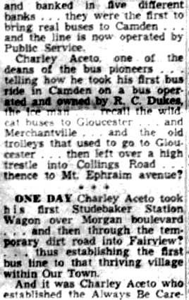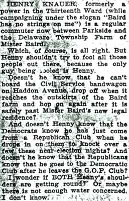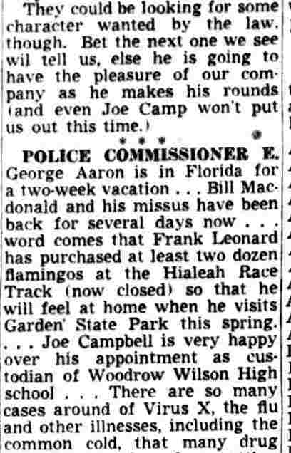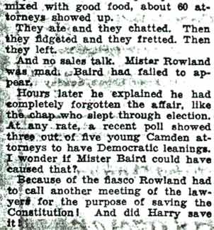 The way some of the members of the Camden County Republican Committee are behaving these days, the Democrats can stay home on their own meeting nights .... The Republicans are doing their work for them .... Now some 70 of the Republican committeemen have signed a petition to give Baird a job that won't pay him anything.... It's about time they're giving him something .... They took the U. S. Senatorship away from him .... Moore took the governorship away from him .... Woodruff took the state committeeship away from him .... The New Deal took the city commission away from him .... The New Deal took the freeholders away from him:.:. Somebody always is taking something away from Baird .... It isn't a question of Baird's ability to fill the bridge job .... The only one to even mention that as an issue was Fred von Nieda .... He's a city commissioner, you know .... It's a matter of principle .... At least, that is what Florence Baker, state com-mitteewoman, says .... Mrs. Baker is telling Senator, Clee and others at Trenton that they owe it to Baird to support him for the job because he has always helped Clee ...Let's, in all fairness to Baird, look at the record .... In the primary, during an address at the First Ward Republican Club, Dave Baird stated he was for Cliff Powell against Clee .... Mrs. Baker did not come out against Clee .... She didn't come out against Powell. Instead, she said she was neutral. In the general election, Mrs. Baker said she was for Clee. Baird never said he was for Clee. (If he had, Clee's majority of 35,000 would have gone to Moore) .... So we don't think that Mrs. Baker is very convincing when she tells Clee that baird helped Clee .... She said that the Camden county legislative delegation helped Clee's program against Hoffman. Was baird a Democrat last year? Sheehan, Roye and Lodge were .... Burling was a Republican, and helped Clee, but he is not for baird. Perhaps it was because baird "helped" Clee's program against Hoffman opposition, that Hoffman slipped in baird's appointment without the knowledge of Burling or the state or county committee members .... Mrs. Baker stated at a banquet that she has copies of the Courier-Post in 1931 in which baird was praised for his bridge work .... If anyone cares to look at our files, we will show what Mrs. Baker said about baird in the neighborhood of 1931. ... Or what we said about baird at other times .... Also what Mr. van Nieda and Frank Travaline said. But enough ado about nothing .... All we've done is talked about baird when it had been our plan instead to talk about politics. * * * The political ax is hanging over the head of a Mt. Ephraim official on the charge he is assuming too much authority ..... The political ax hanging over the heads of the Delaware township cops is about to be enmeshed in litigation .... One of the policeman is a member of the P.B.A. which will carry his fight into court in a case that will be a precedent for the other township cops, too .... Herb Taylor will be county engineer if it goes to a Republican .... It may be a Democrat however, and newest among the candidates, on that side of the ledger is former City Commissioner Carroll P. Sherwood .... There may be only one assistant county solicitor instead of two in which case it will probably go to Carleton Rowand, city school board member .... By the way, don't, be surprised if under the new contract between the city and county on maintenance of the City Hall, the city takes full control of the building with consent of the county ... Which will be tough on some of the county jobholders ...* * *. Assemblyman Allen now denies he wants all us newspaper fellers to go to the guillotine ... He says he meant lawyers ... Charlie Humes wants to be guillotined ... Standing up ... Incidentally, Charlie is defending his last-place position in the ping-pong league tonight… Firefighter Lennox went to church the other day… And found the roof braced up. When will the borough of Merchantville fix up that dangerous hole in Browning road at the railroad tracks north of Maple Avenue? ... Or is that in the township? Whenever the state police want Detective Wojtkowiak at the prosecutor's office, ·they ask for "Sergeant Watchyourcoatandhat" … The Mt. Ephraim commissioners are going to buy a police car for their chief ... He's also in for a pay rise ... Bellmawr's chief of police won't get the salary increase he wants, but he will get an additional allowance for the use of his car ... Runnemede's two new cops will also get pay increases … The other day an alarm was sent to every police department in the county and also to the Philadelphia cops that a car had been stolen in Audubon ... The culprit is glad no cops saw him ... He was none other than a police official who wanted to borrow a storekeeper's car but took the wrong one by mistake ... His face is almost as red as Vince (deP) Costello's ... At the K. of C. roller skating exhibition the other night, Luke McKenna did a few fancy turns ... Vince recalled he, too, had been pretty good at one time, so he essayed to show his friends ... His intentions were better than his legs, and a couple of well--wishers followed him around the floor with a stretcher. This all happened quietly The Runnemede police received a complaint from two storekeepers ... It appears that a group of high school students from another town had stopped off at Runnemede to purchase some cakes ... Several other articles disappeared from the stores ... A few days later the dean of the high school went to Runnemede paid one shopkeeper $10 and the other $2.60 ... Representing the goods they said were taken ... Aside to that clairvoyant weakly editor who reported yesterday that Joe Van Meter is going to be the Republican nominee for sheriff: A sheriff cannot succeed himself in New Jersey ... Silvio Fittipaldi, former Haddon Heights High star, is a veterinarian and doing nicely ... A Philadelphia college professor who lives in Pennsauken