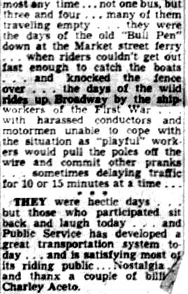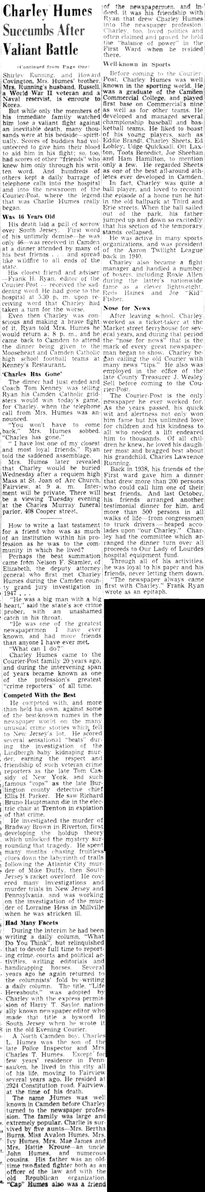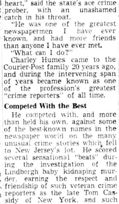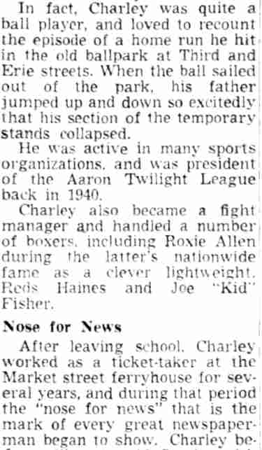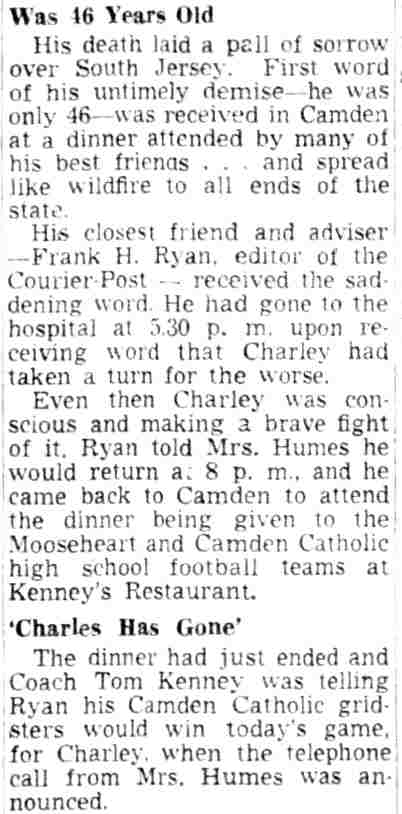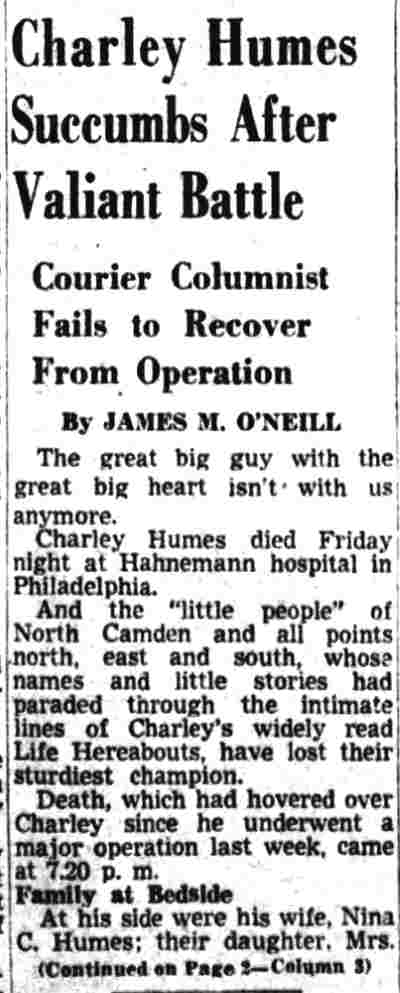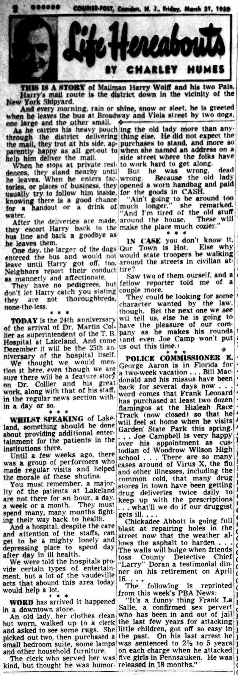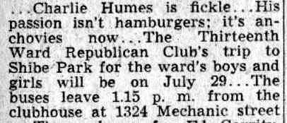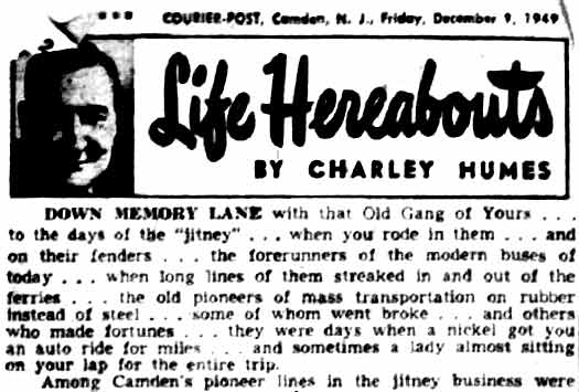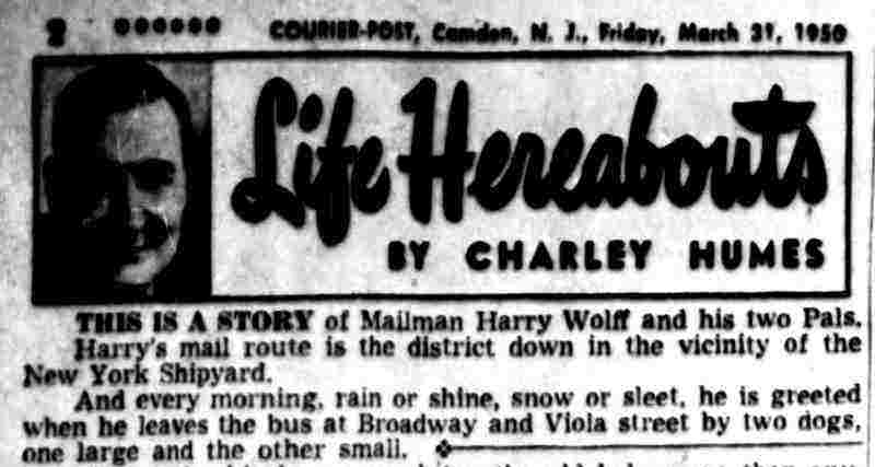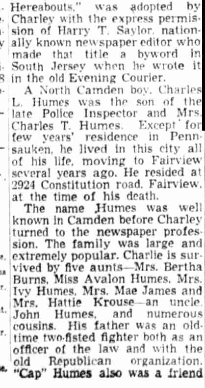 What Do YOU Think? By CHARLEY HUMES THINGS I'D LIKE TO WRITE ABOUT. (If only I were a columnist). About Eddie Lobley and his new job as a school marm (or should I say professor) ... which he worked so hard to obtain ... If I were a kid again I'd feel proud to study under that guy ... And if they have any athletics down at Fetters .. you can bet your spare dimes those kids will know what it's all about ... About that north camden blonde ... the one who goes into that Broadway shop and slips the manager there some do-re-me .. which he uses to pay his board … And the Gal parades Broadway... near the store ... to keep an eye on her gigolo .... About that Cooper street house ... 'neath the shadows of a great industrial plant ... which is running wild ... and harbors, among others, that mother of those tiny youngsters ... And like Eva Tanguay ... She doesn't care ... Ketch on, sister ... About my friend Harris ... up at the Garden State I've watched hundreds hungry and broke ... and heard their praises after they met up with Harris ... About Fitz and that joke he told on Ralph Bull and me ... In which I'm 300 years late (I'm putting the joke here to make it public) in getting the story of the beheading of Mary, Queen of Scots ... Well, Fitz oughtta know ... That was the first infliction of the death penalty he ever watched .... ' About a Third Ward gangster ... who poses as a politician ... and parks his car in spots where he knows it'll draw an argument ... just to show his authority … the unkpay ... About the internal scrap in a certain Pennsauken political organization ... in which a good fellow was ousted with a bad one (merely my opinion) ... And about certain chaps in the, enemy camp who are, chuckling now (but won't when their own gimme goof starts showing his true colors) ... About a Delaware, township political feller ... who intercedes every time one of his friends gets pinched for drunkee ... And the reason is because the political feller sells them the stuff ... ketch on ... oh, yes, I could print names…. About two Chester boys making book in Deepwater ... much to the dismay (and disgust) of some of the local gamboleers ... About a downtown plug-ugly who represents a Philly underworld dive ... and parks nightly ... where he can watch the girl he believes will be his next victim ... And this to remind him ... that the girl's brother is that blonde-headed fella parked several seats away ... which oughtta make things interesting ... Because the brother knows ... and is merely awaiting a legitimate excuse to tear the sheik apart and find out what makes him go ... ' About a big shot city hall employee ... who has a good-looking car ... and a good-looking girl to put in it ... but who takes the back roads of Burlington county, when the not' so-good looking girls are his playmates .... About those North Camden swim min' holes ... where buck bathing has been a rite for more years than I can tell …' where my friends and fathers of my friends have cavorted ... away from prying eyes ... And now, they're gonna start raidin' the places ... And most of, those kids not able to afford a bathing suit, either. |