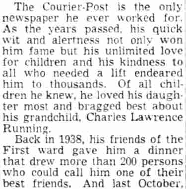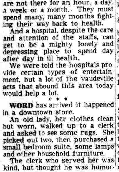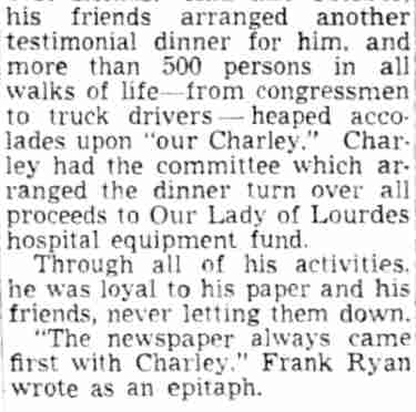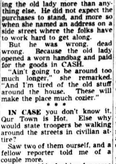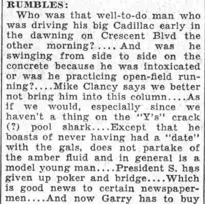 he arrived. *** THEN there is the time that your Corpulent Correspondent was talking with old “Pop” Daly up at Second and Vine streets on a sunny Sunday morning and two men came up ... to tell “Pop” that the son of one of them had been arrested on a minor charge ... and would “Pop” go down to City Hall and get him out ... “Pop" would and asked us to drive him there ... on arrival, "Pop" learned that a new order made it necessary to post $10 security for the release of anyone charged with this minor offense ... and "Pop" turned to us and asked us if we had $10 ... and we had ... so we posted it ... thinking that if Pop would take care of the sawbuck on his return home ... but after we left the two men off ... and we waved the police receipt all around, hinting about the $10 ... Pop told us to be in court the next morning and intercede for the boy .... and if he got out free ... then we could get our $10 back. *** WHILST DWELLING on “Pop” Daly, who was one of the grandest men ever to live in Our Town there is another story we would like to relate at this time; Pop, you see, was the kind of a man who was always trying to help the fellow in trouble, and one day a mother came to him and told him her boy had been arrested ... and was to have a hearing before Judge Mariano within the hour ... Pop dressed and hurried to the "Hall” . . . and when the case was called . . . he stood by the side of the young boy as the facts were related . . . and then "Pop" made his plea to the court. "Your Honor,” Pop said. "This is a good boy. I know his mother. I have known him all his life, and he has never been in trouble before (which was true) . . . and, I feel that it Your Honor will give him another chance, he will never get in trouble again (which up to this day is also true). He is a fine lad, but all of us make mistakes . . . I see this boy nearly every day and I know he is a good boy...” Whereupon the Court, knowing full well the tenderness of the heart of John “Pop" Daly, quietly asked: “What is the boy’s name. Mr. Daly?” And Pop, unabashed and unafraid, turned to the lad and queried: “What is your name, son?" *** THE CASE was dismissed
