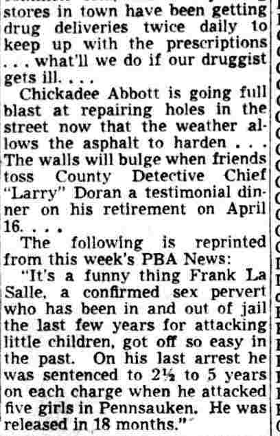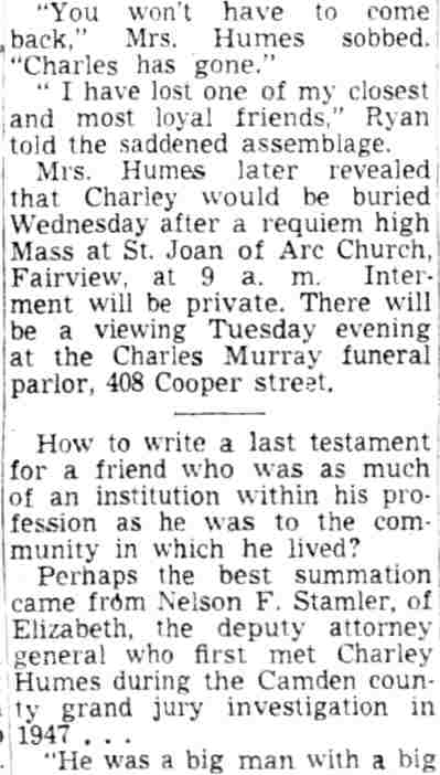 GOOD Republican. CHARLEY HUMES * * * Hushemups That Arrived With the Rain! Is there a new coalition out in Pennsauken which is attempting to oust Les Rogers? And are those in on the deal Mrs. Florence Baker, Bill Wimer and Mrs. Elsie Geister? And do they have the "undercover" support of Mrs. Elizabeth Verga and Doc Stem? ... How will Senator "Cliff" Powell explain to his Burlington county Republicans his opposition to the vote probe in Hudson county? Or is he so sure of himself that he thinks he can prove, but definitely, that he always has been tied up with the Hoffman-Hague combine and still win up there? ... Who was it that holds a state job, who found a brand new automobile in his yard at Xmas? And howzabout those other state jobholders who received those mysterious gifts at the same time? Do they know they are being investigated, and certain people are anxious to know the reason for the presents? ... A Haddon Township Democrat will get Charley Clark's job on the county election board and a Camden City Democrat (probably Ed Borden) will replace Mary Tegge (Mister Baird's new confidant) on the county tax board. Did you know that Johnny Morrissey won the election for the anti-Bradway group. in Wildwood? Get Johnny to admit what he did in the Second Ward. Hague is being given a lot of credit for winning Wildwood, but that is a lot of malarky. The reason Morrissey, et aI, were there was as a favor to Pat Short, the Democratic leader, and they were asked to go there by Eddie Kelleher. Those 10 deposed political leaders who invested 250 slugs in the "new county paper" are in bad with a lot of weekly publications hereabouts. These rags have turned all manner of flip-flops to garner the county advertising and now more competition, yet. |