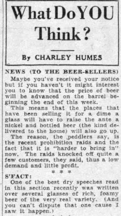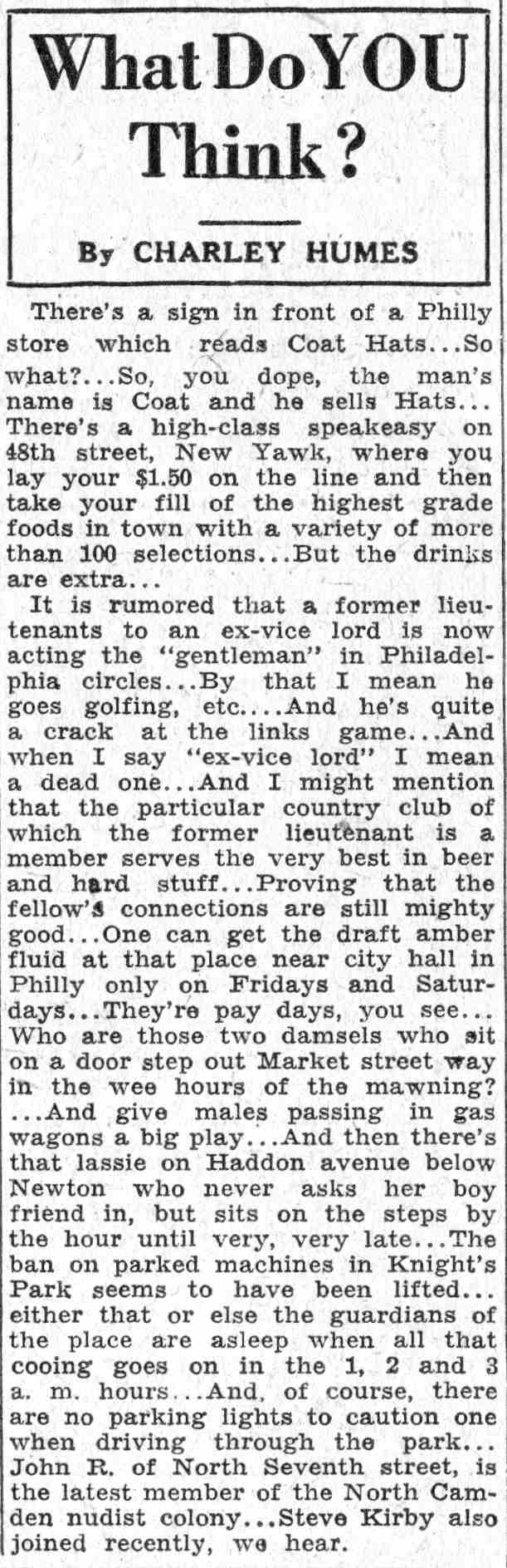 What Do YOU Think? By CHARLEY HUMES There's many a heart throb that never gets into the papers, F'rinstance, the other night up in North Camden a family of three were enjoying the comforts of their cozy little home when- bing, and they're all in a turmoil. It was the night of the $5,000,000 rum ring story. A car bearing New Jersey tags came within the scope of the investigators and news hounds. It was registered in the name of a North Camden lass and a reporter was dispatched to her home to find what, if any, connections she had with the rum smugglers. The reporter was admitted to the girl's home by her father, his pipe and paper were beside the radio. The mother was busy about the kitchen, another daughter sitting in another room. Everything was quiet and peaceful. And then the reporter made known his errand. The eyes of the father stared ahead as the mother wiped her hands on her apron. The daughter merely gasped and said nothing. They were thunderstruck by the news, but all three immediately came to the defense of the daughter. Frantic telephone calls. Worried voices. All for what? Just because some dizzy bird in Philly was attempting to scare up a sensation. The daughter was finally located. She admitted being where reports had her but explained her reason. It was a simple one. It was true. And she dared anyone to print anything different. Plucky Girl. And then the family relaxed. They went back to their cozy habits, just a little the worse for the scare. And the reporter? Why he went in search of other news. * * * Some guys oughtta be shot. That's our opinion of a low-down hoss-thlef of a man who would come out of the West with a title of Superin-general or sumpin', Investigate conditions at a South Jersey factory, lower wages so that a family could not survive off them, make working conditions in general miserable, and do all manner of things to the hired help so that the board of directors, who don't investi-gate methods, will heap praise upon him and then spend his nights at the best shows. Sleep In the best hotels. Eat In the best restaurants. And do as he pleases because he gets a big, juicy salary. * * * NO EXTRA CHARGE FOR ALL THIS Patrick J. Ryan, Federal man in charge of the local drys is not going to remain long … He is an important fella in the prohibition situation and is here only to organize the local unit. So that's what's been the matter. They've been unorganized: … When Patrick J. leaves his place will be taken by a chap named Johnson… Who lives with his family in Delair… And if all this don't happen we'll fire one of our spies … We have it on good authority that the iron workers' strike at the new Post Office operation will be settled in time for the men to go to work early next week … In whose office were those slips bearing information regarding the local prohibition enforcement crew printed? … And why didn't ALL the Beer Men get them? How Morris Green can eat when someone else is paying the bill. … Things must be tough in Strawberry Mansion … Eh, Morris … The Ma and Pa of Edward V. Martino, youthful attorney, will celebrate their 26th wedding anniversary tomorrow night. Eddie and one brother survive The Fourth Annual picnic of the Kaighn Avenue Suckers' League will be held this coming Sunday at a spot near Blenheim … Everything free But fetch along a lot of dough… You Suckers … The "Boys" down that-a-way need new overcoats, you know … There's an old farmhouse near Riverton where you, you and even you can lay 'em across the board … The Gamboleers there are mostly from Philly … We wonder if that inebriated person in that Broadway restaurant knew his gun was showing … And that he scared Us out of one hamburger … The nut… |